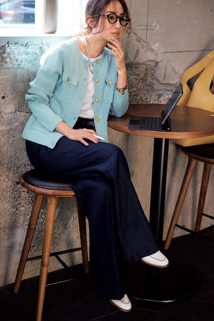 フロントのポケットと金ボタンでお仕事スイッチをON。畏まりすぎないきちんと感を狙って。カーディガン ¥28,600 Tシャツ ¥16,500 パンツ ¥31,900 シューズ※参考商品(すべてブルックス ブラザーズ/ブルックス ブラザーズ ジャパン)バッグ ¥58,300(ヴァジック/ヴァジックジャパン)メガネ ¥44,000(アイヴァン/アイヴァン 東京ギャラリー)ピアス ¥5,500 ゴールドネックレス ¥9,180 パールネックレス ¥22,050 ブレスレット ¥6,300(すべてアビステ)