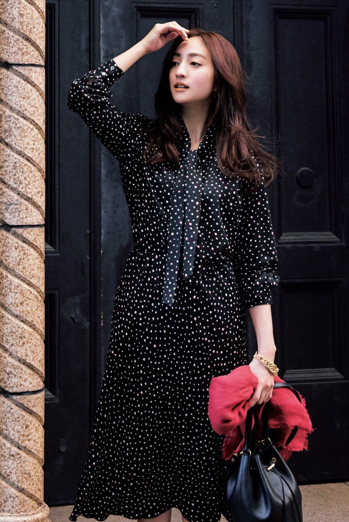 胸元のボウタイが女性らしい、ランダムドット柄のブラウスとフレアスカート。とろみのある生地は肌なじみよく、袖を通すだけで大人の表情に。セットで単品で、シーン問わず活躍してくれます。ブラウス ¥28,600 スカート ¥30,800 バッグ ¥61,600(すべてブルックス ブラザーズ/ブルックス ブラザーズ ジャパン)ストール ¥29,700(スロー)ピアス ¥110,000〈ウノアエレ〉ブレスレット ¥22,000〈ワンエーアールバイウノアエレ〉(ともにウノアエレ ジャパン)