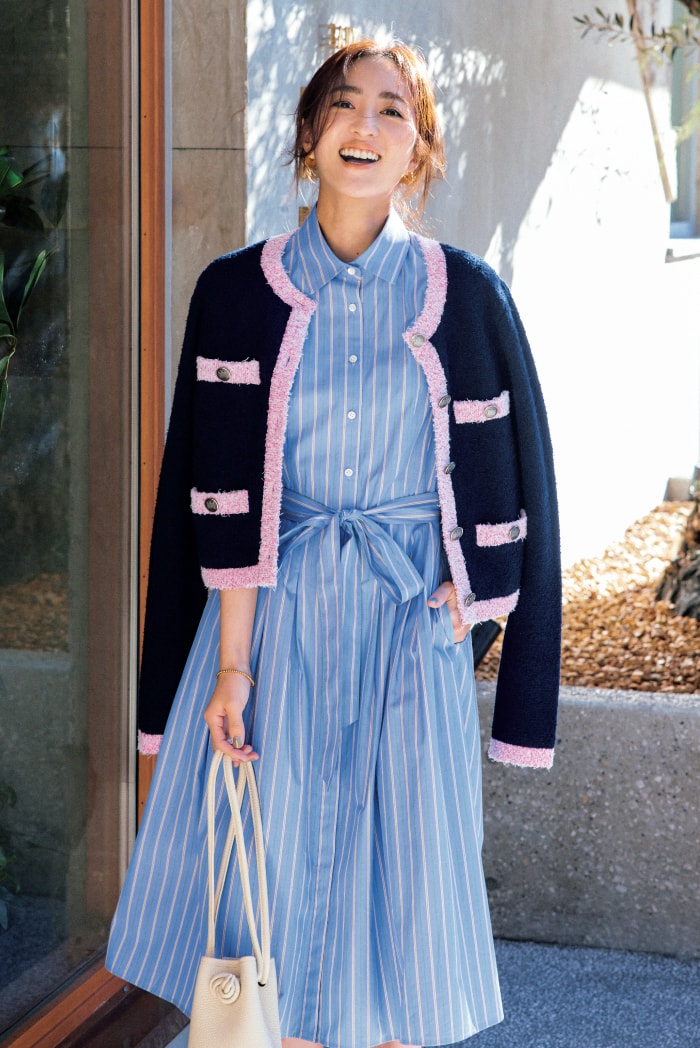 程よいハリ感を持つ、コットンポプリンのシャツワンピ。ピンクとグリーンでアクセントをつけたブルーのストライプは、夏にぴったりの清涼感です。上までボタンをきちんと留めてグッドガールな装いに仕上げるのが気分。ワンピース ¥36,300 カーディガン ¥39,600(ともにブルックス ブラザーズ/ブルックス ブラザーズ ジャパン)バッグ ¥31,900(ヴァジック/ヴァジックジャパン)ピアス ¥37,400〈プラウ〉ブレスレット ¥18,700〈シンパシー オブ ソウル スタイル〉(ともにフラッパーズ)