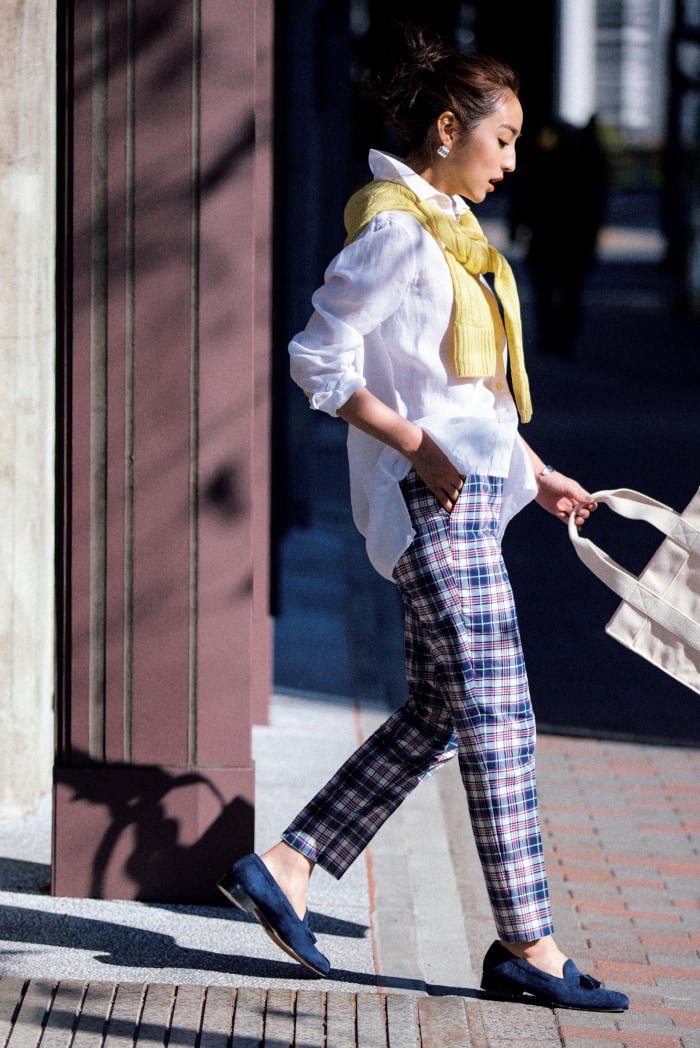 白、赤、ネイビー…星条旗配色のマドラスチェックが爽やかな九分丈パンツに、リネンの白シャツを重ねたトラッドスタイル。清潔感あふれるヘルシーなムードを、この夏存分に楽しみたい! シャツ ¥22,000 パンツ ¥28,600 肩にかけたニット ¥31,900 バッグ ¥20,900 シューズ※参考商品(すべてブルックス ブラザーズ/ブルックス ブラザーズ ジャパン)ピアス ¥11,000 バングル ¥13,200(ともにワンエーアールバイウノアエレ/ウノアエレ ジャパン)