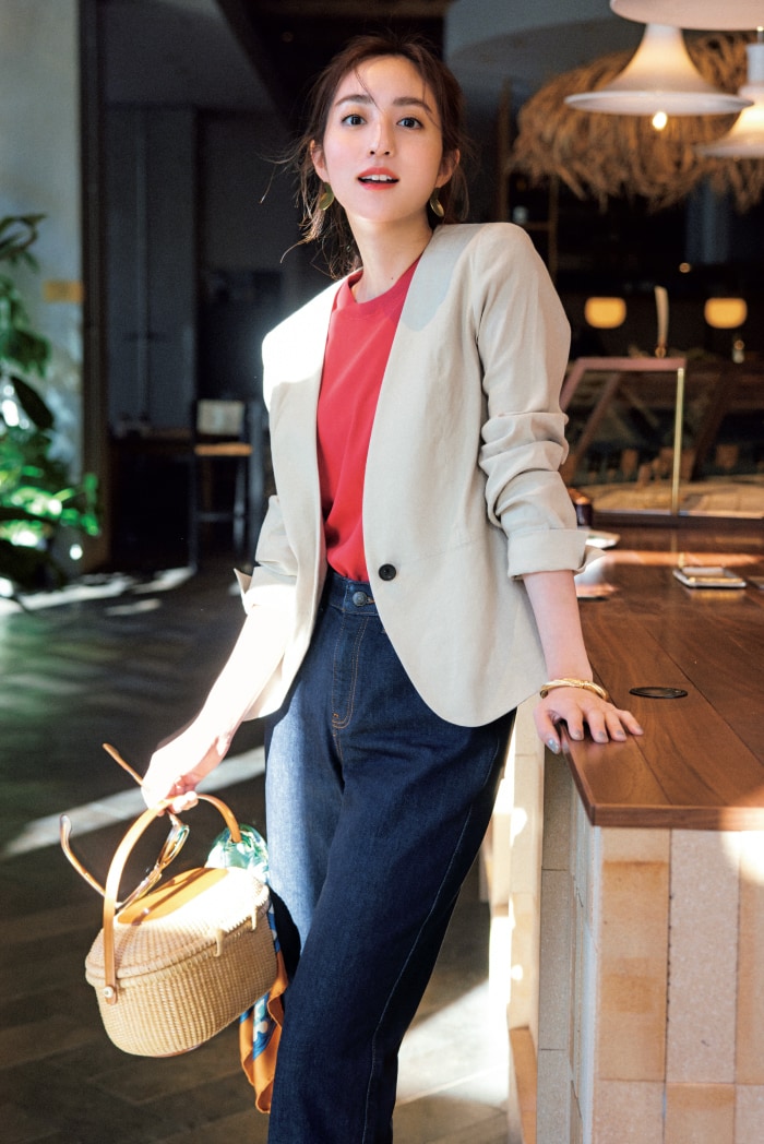 夏らしくリラクシーなムードが感じられるリネン混のジャケットで、デニムコーデをカジュアルアップ。ノーカラー&裏地なしだから、秋口まで大活躍。ジャケット ¥42,900 ニット ¥13,200 デニムパンツ ¥26,400 かごバッグ※参考商品(すべてブルックス ブラザーズ/ブルックス ブラザーズ ジャパン)スカーフ ¥19,800(マニプリ)サングラス ¥46,200(モスコット/モスコット トウキョウ)ピアス ¥11,000(メラキ/フラッパーズ)バングル ¥9,450(アビステ)
