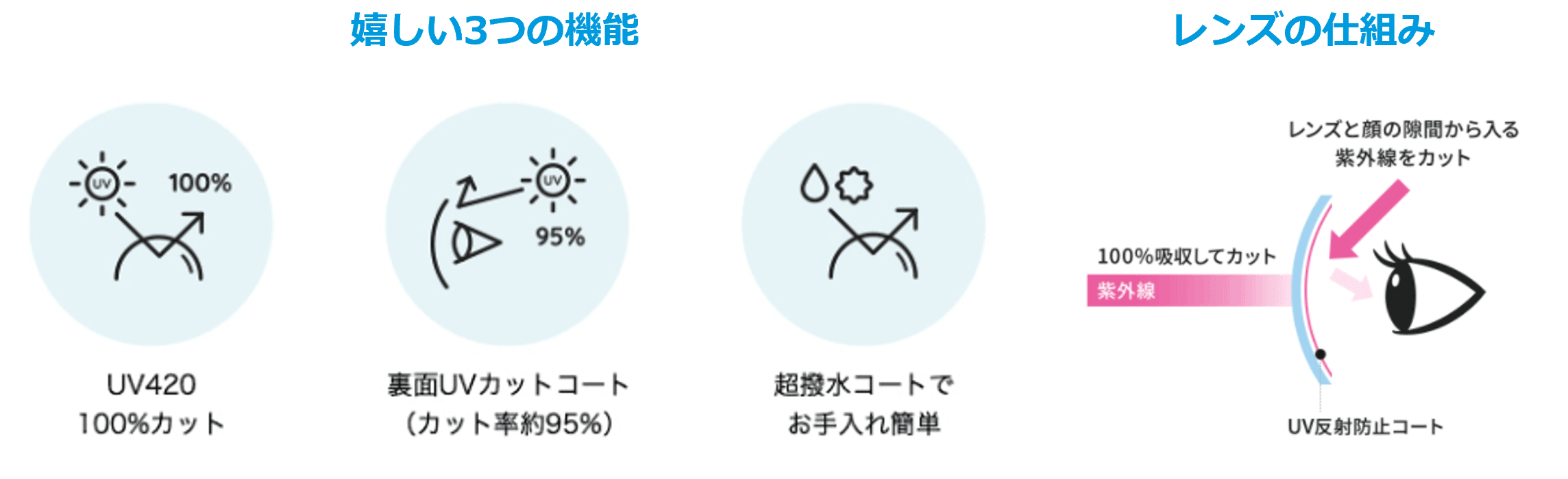 本フレームに搭載されている「Zoff UVクリアレンズ」は、紫外線のみならず420nm(ナノメートル)までの有害光もカットするUV420の高機能レンズを搭載しています。通常紫外線の多くはレンズの前面に当たりますが、上から降り注ぐ紫外線の一部は、レンズの裏面に反射して目に入る可能性がありました。「Zoff UVクリアレンズ」は裏面にUV反射防止コートを施すことで、この反射光もしっかりカットし、あらゆる方向の紫外線から目を守ります。