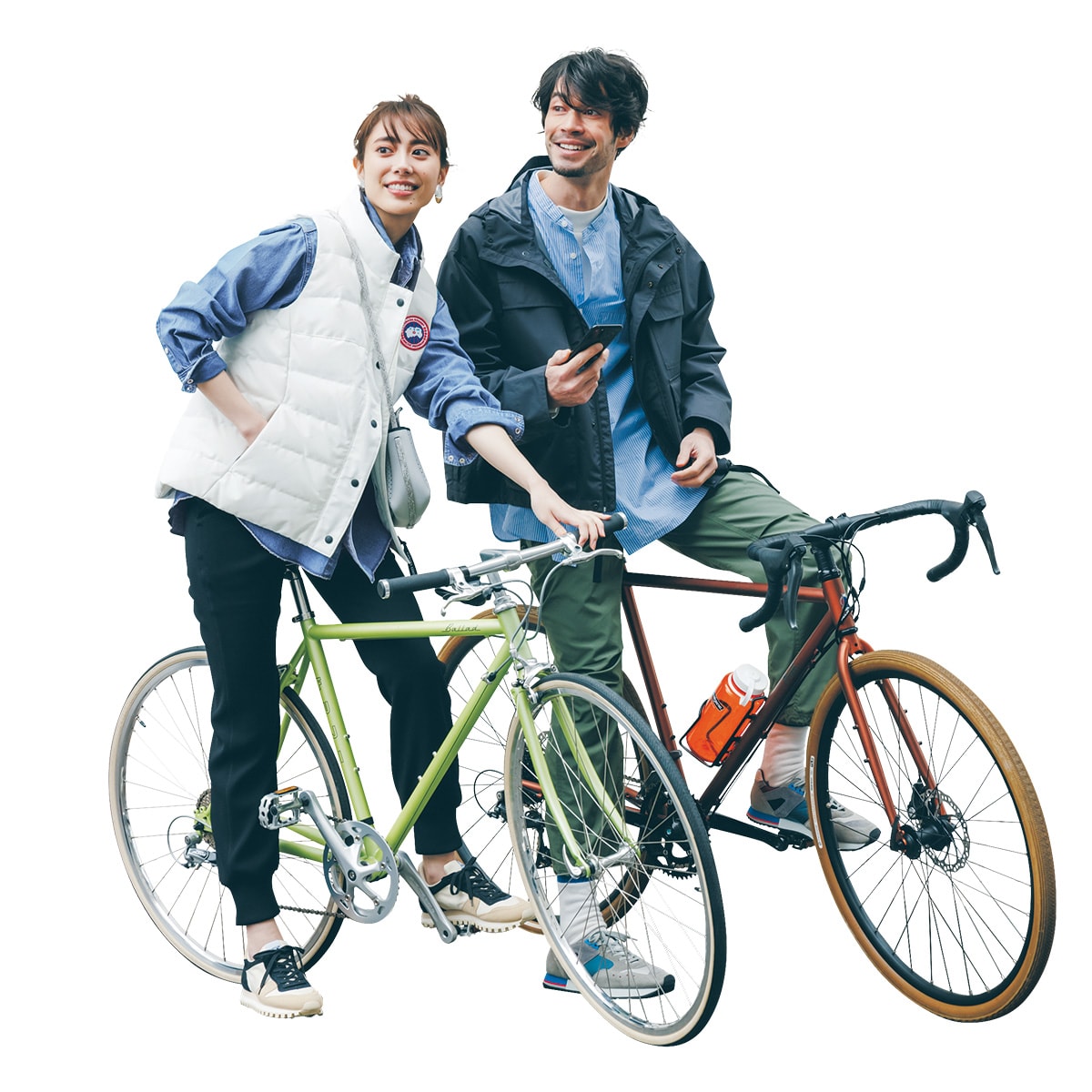動きやすく暖かいダウンベストは自転車の日の便利アウター。素敵なカフェやレストランを見つけてフラッと入る際にも対応できるデニムシャツを味方に。ベスト¥68,200(カナダグース)シャツ¥15,950(ラングラー/エドウイン・カスタマーサービス)パンツ¥26,400(ソブ/フィルム)バッグ¥36,300(ステート オブ エスケープ/サザ ビーリーグ)スニーカー¥24,200(NOVESTA/ドレステリア渋谷スクランブルスクエア店)イヤリング¥11,000(マージョリー・ベア/ココシュニック オンキッチュ有楽町マルイ店)自転車〝BALLAD〞¥92,400(FUJI BIKES/アキボウ)[男性]ジャケット¥50,000(ジュゲム/ヘムトPR)、シャツ¥17,000(スティル バイ ハンド/スタイルデパートメント)、インナーカットソー¥25,300(エーケーエム/AKM)、パンツ¥19,800(サンディニスタ/ベンダー)、シューズ¥30,800(リプロダクション オブ ファウンド/アイ ファウンド)自転車〝FEATHER CX +〞¥132,000(FUJI BIKES/アキボウ)