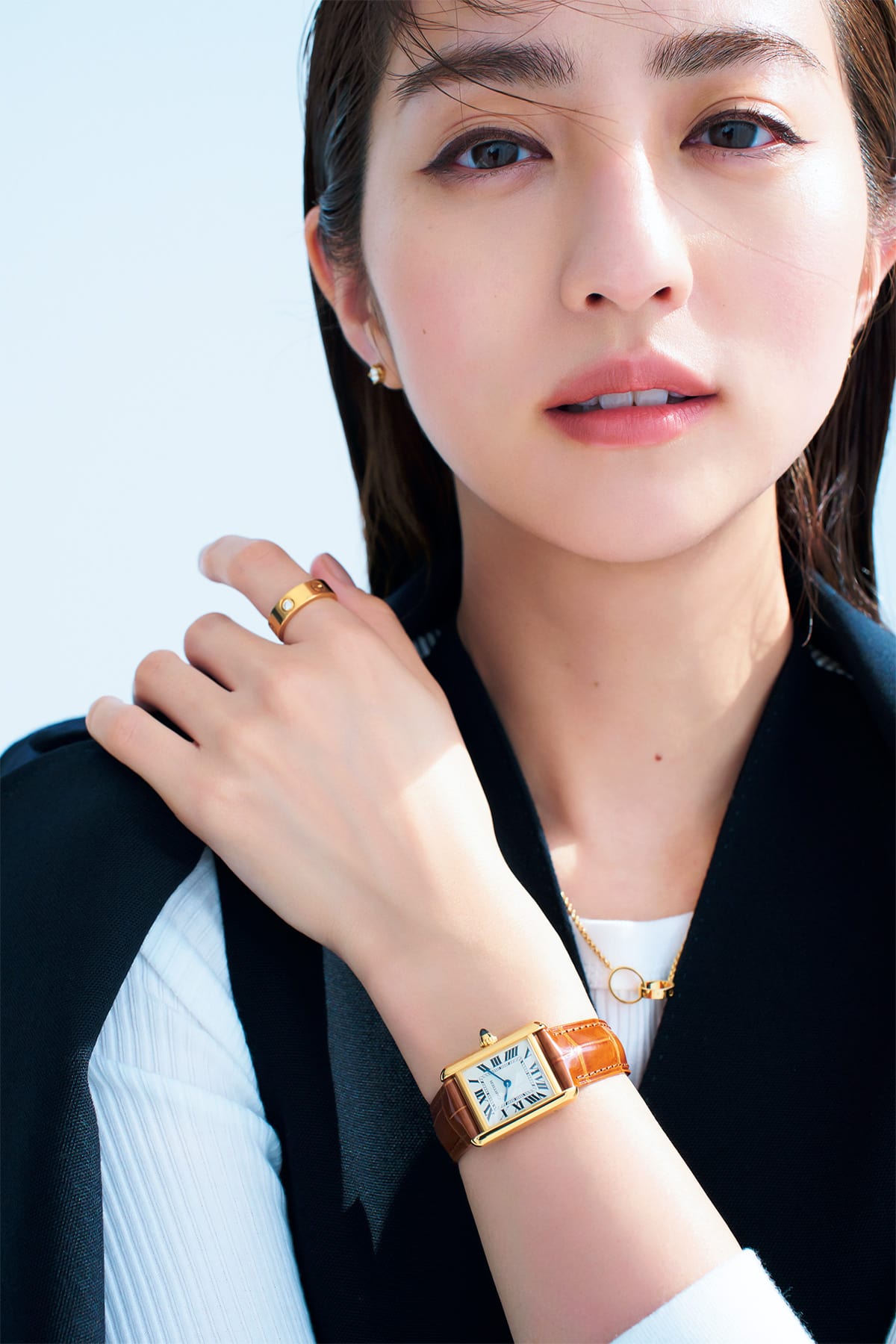 時計のある手元、さらにハンサムな印象だと、知性が際立って見える気がして…と茜ちゃん。クラシックな佇まいに、ゴールドの繊細な差異、革ベルトのセレクトでさりげなく個性を演出。時計「タンクルイカルティエ」¥1,372,800イヤリング¥704,880ネックレス¥338,800リング¥550,000(すべてカルティエ/カルティエカスタマーサービスセンター)ジャケット¥55,000ベスト¥33,000(ともにDESPRÉS)カットソー¥9,900(ハイク/ボウルズ)