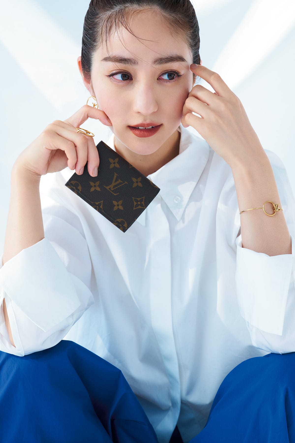 開閉式のスナップで、見た目もスマート。「アンヴェロップ・カルトドゥヴィジット」〈H18×W10.5×D1㎝〉¥41,800 ピアス¥59,400ブレスレット¥53,900リング¥41,800(すべてルイ・ヴィトン/ルイ・ヴィトン クライアントサービス)シャツ¥45,100(EVAMANN/THIRDMAGAZINE)パンツ¥89,100(コー/イーストランド)