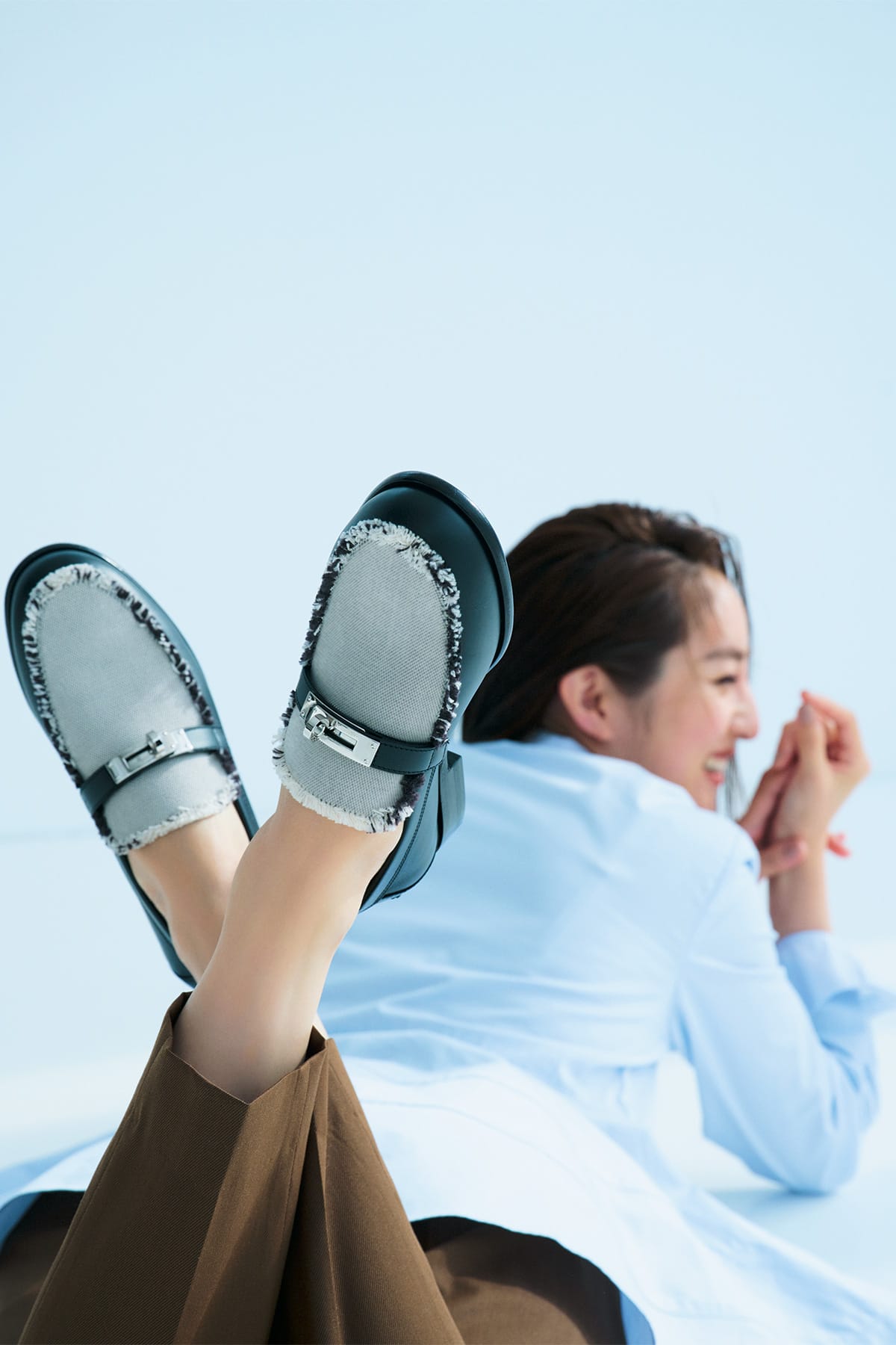 一目でそれと分かる、メゾンの歴史に裏打ちされたアイコニックなデザイン。ローファーの持つ生真面目さを緩和する、レザーとキャンバスの組み合わせに注目したい。ローファー〈H:2㎝※実寸〉¥204,600(エルメス/エルメスジャポン)ブラウス¥73,700(コー/イーストランド) パンツ¥25,300(バッカ/ビーエディションニュウマン新宿店)