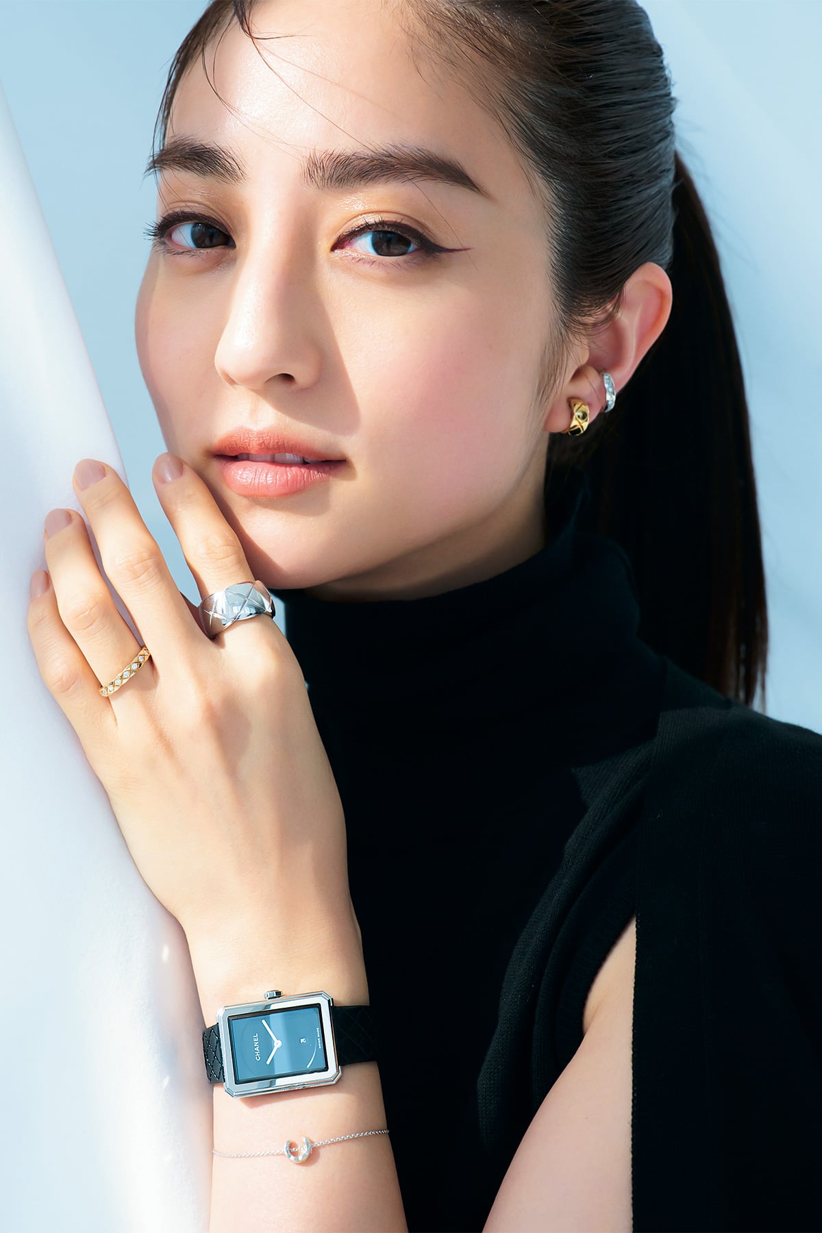 時代に即した、ジェンダーレスの想形。時計「ボーイフレンド」¥682,000イヤリング〈YG〉¥561,000 イヤーカフ〈WG×DIA〉¥323,400 ブレスレット〈WG〉¥271,700リング人差し指〈WG〉¥583,000薬指〈YG×DIA〉¥566,500(すべてシャネル/シャネル カスタマーケア)ニット¥22,000カーディガン¥28,600(ともにスローン)
