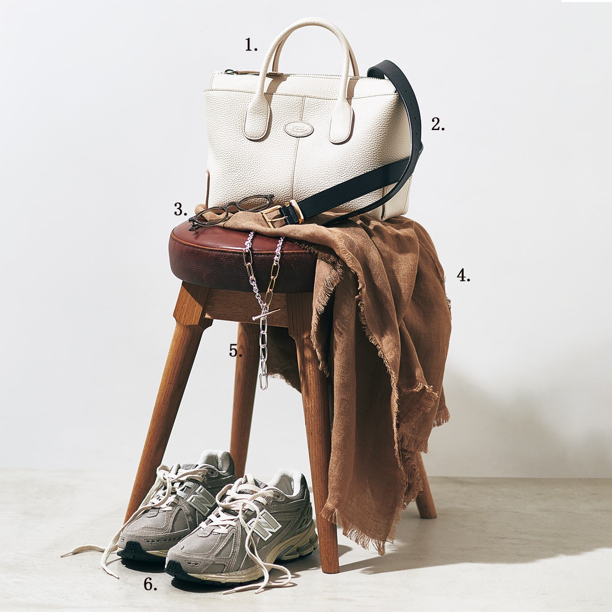 1.バッグ¥292,600(トッズ/トッズ・ジャパン)2.ベルト¥15,400〈アルアバイル〉3.メガネ¥36,300(アイヴァン/アイヴァン 東京ギャラリー)4.ストール¥29,700〈スロー〉(ともにアルアバイル)5.ネックレス¥16,500(イン ムード/フォーティーン ショールーム)6.スニーカー¥19,800(ニューバランス/ニューバランスジャパンお客様相談室)