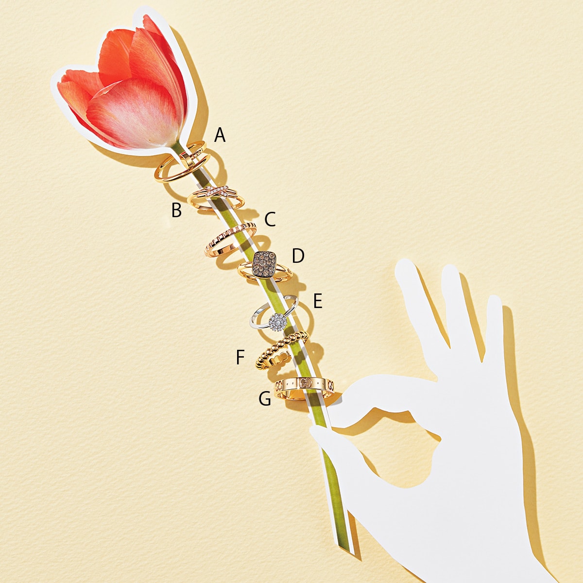 A.コーデにほんのりエッジィさをプラス。〈YG〉¥177,100(カルティエ/カルティエ カスタマーサービスセンター) B.絆を意味するメゾンを代表するアイコニックなピース。〈PG×D〉¥189,200(ショーメ) C.長く愛せる飽きのこないデザイン。〈PG〉¥150,700(ブシュロン/ブシュロン クライアントサービス) D.一点投入でも抜群の存在感。〈RG×ブラウンダイヤモンド〉¥187,000(ポメラート) E.大人の女性にこそ似合うエレガントでキュートな佇まい。〈WG×D〉¥169,400(ダミアーニ/ダミアーニ 銀座タワー) F.どんなリングとも相性がよくレイヤードを楽しみやすい。ミディアムモデル〈YG〉¥177,100(ヴァン クリーフ&アーペル/ヴァン クリーフ&アーペル ル デスク) G.ブランドらしさを存分に楽しんで。〈YG〉¥132,000(グッチ/グッチ ジャパン)