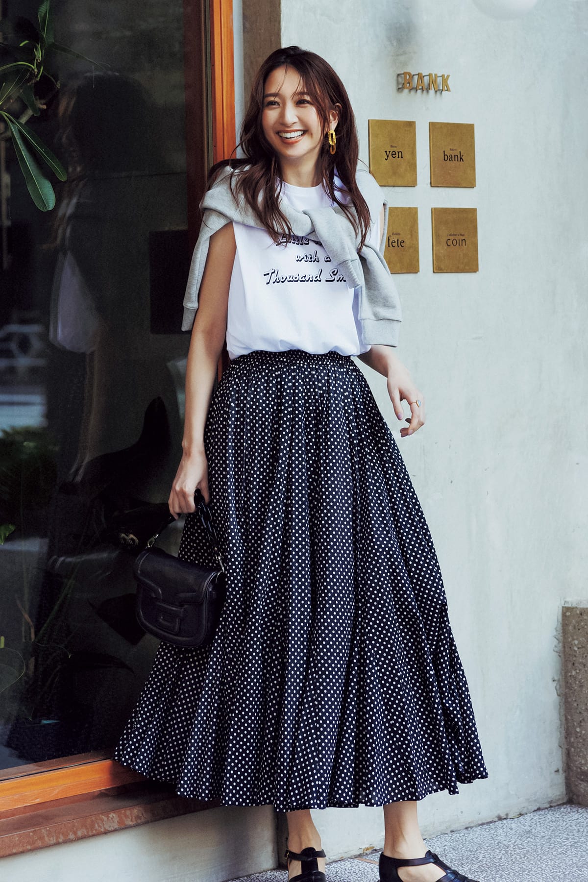 可憐なドット柄も、ハンサム小物とモノトーンのおかげで、日本橋の街並みに似合うシックなムードに。カットソー¥15,400(サクラ/インターリブ)スウェット¥5,390(フルーツオブザルーム/ギャレット)スカート¥36,300(マリハ フォー ユナイテッドアローズ/ユナイテッドアローズ 六本木ヒルズ店)バッグ¥180,400(ピエール アルディ/ピエール アルディ 東京)シューズ¥68,200〈ネブローニ〉イヤリング¥13,200〈メラキ〉(ともにフラッパーズ)リング¥248,600(マリハ)