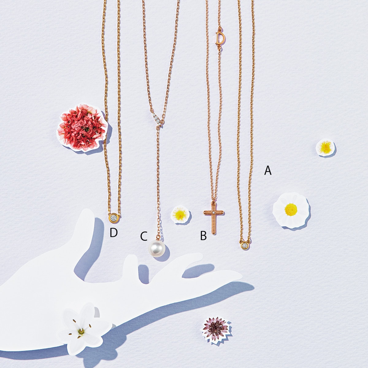 A.ひとつは欲しい〝一粒ダイヤ〟の代表的存在。〈RG×D〉¥134,200(ティファニー/ティファニー・アンド・カンパニー・ジャパン・インク) B.神秘的なデザイン×ピンクゴールドがロマンティック。〈PG×D〉¥180,400(ダミアーニ/ダミアーニ 銀座タワー) C.シンプルなパールはカジュアルにもきれいめにも相性抜群。〈PG×あこや真珠×D〉¥176,000(ミキモト/ミキモト カスタマーズ・サービスセンター) D.一生モノとして愛したい逸品。〈YG×D〉¥149,600(カルティエ/カルティエ カスタマー サービスセンター)