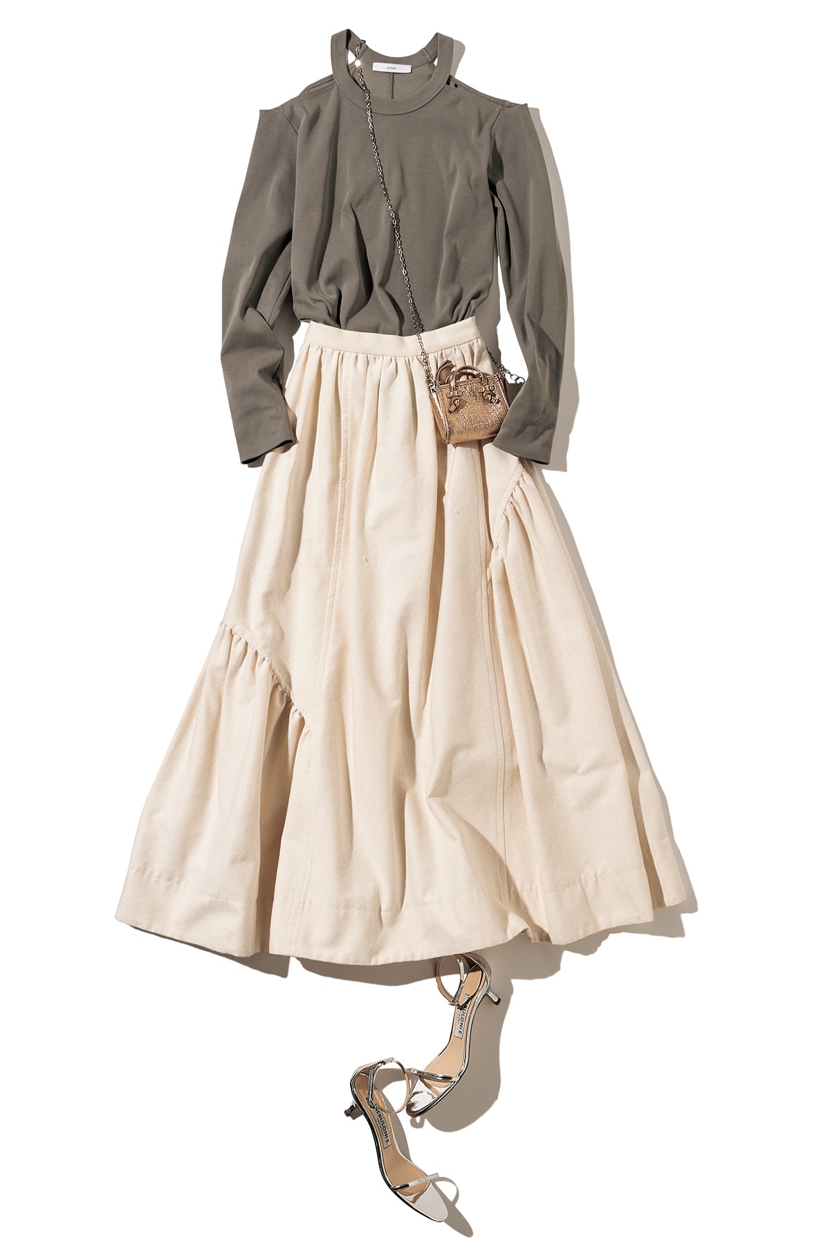 カットオフで部分的な肌見せを楽しむくらいが、大人っぽくてちょうどいい。夜遊び=黒ではなく、やわらかなニュアンスカラーや女らしいシルエットでまとめるのが今の気分。メタリック小物がお出かけ気分を後押し。カットソー¥13,200(アストラット/アストラット 新宿店)スカート¥42,900(ソブ/フィルム)バッグ¥18,700(ジャンニ キアリーニ/ジャンニ キアリーニ 銀座店)サンダル¥57,200(ネブローニ/デミルクスビームス 新宿)