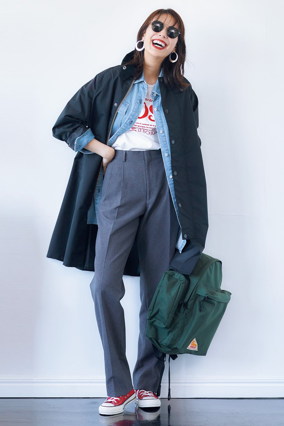 バブアーのコートにデニムシャツ、スラックス…ときたら、小物もリュックやコンバースでボーイズっぽく振り切って!パンツ※着回し コート¥51,700(バブアー/バブアーパートナーズ ジャパン)シャツ¥17,600(ヘルシーデニム/ゲストリスト)Tシャツ¥15,400(ル ブーケ)リュック¥17,600(ケルティ/アリガインターナショナル)スニーカー¥9,350(コンバース/コンバースインフォメーションセンター)サングラス¥47,300(モスコット/モスコット トウキョウ)ピアス¥12,960(アビステ)