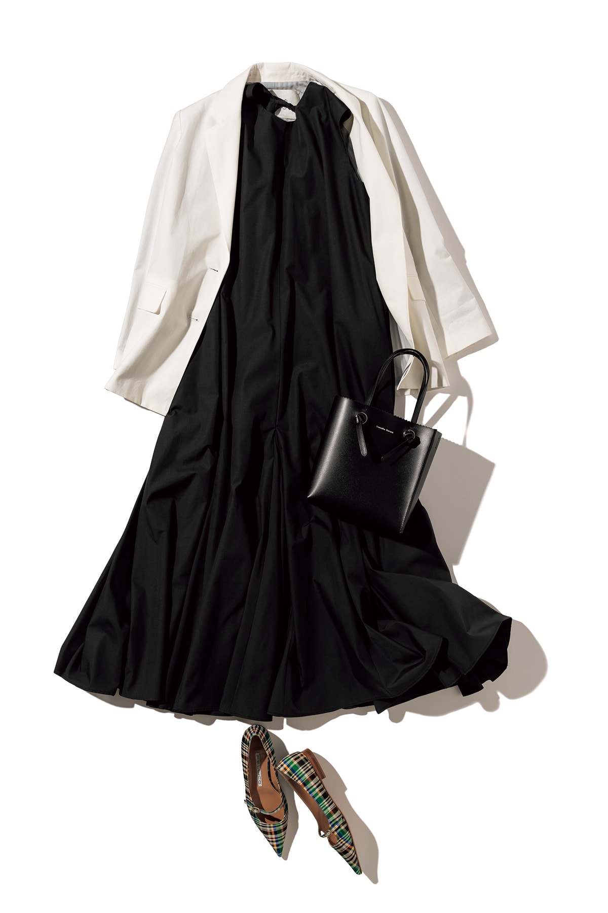 リゾートライクなシルエットのワンピースにジャケットを添えてオフィカジ仕様に。手持ちの黒ワンピにもハマって、きちんと感のなかに爽やかさ、軽やかさが出せる白ジャケットは、ビジネスシーンでも大活躍。ジャケット¥61,600(ルームエイト/オットデザイン)ワンピース¥27,500(カデュネ)バッグ¥46,200(サマンサタバサ/サマンサタバサ ルミネ新宿店)シューズ¥62,700(ペリーコ/オデット エ オディール 新宿店)