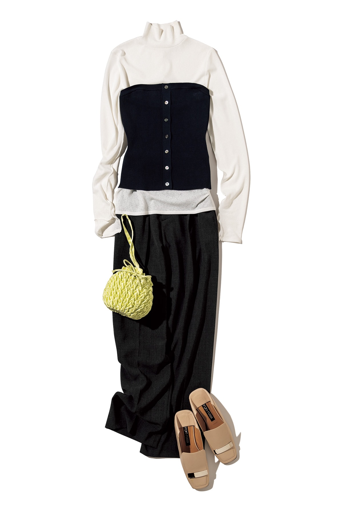 鮮度が高まるレイヤードで気分転換を。カットソー¥7,480(emmi/エミ ニュウマン 新宿店)ビスチェ¥9,900(ビューティ&ユース/ビューティ&ユース ユナイテッドアローズ 丸の内店)パンツ¥19,800(ジャーナル スタンダード レサージュ/ジャーナル スタンダード レサージュ 銀座店)バッグ¥58,300(マーレット/サザビーリーグ)シューズ¥104,500(セルジオ ロッシ/セルジオ ロッシ カスタマーサービス)