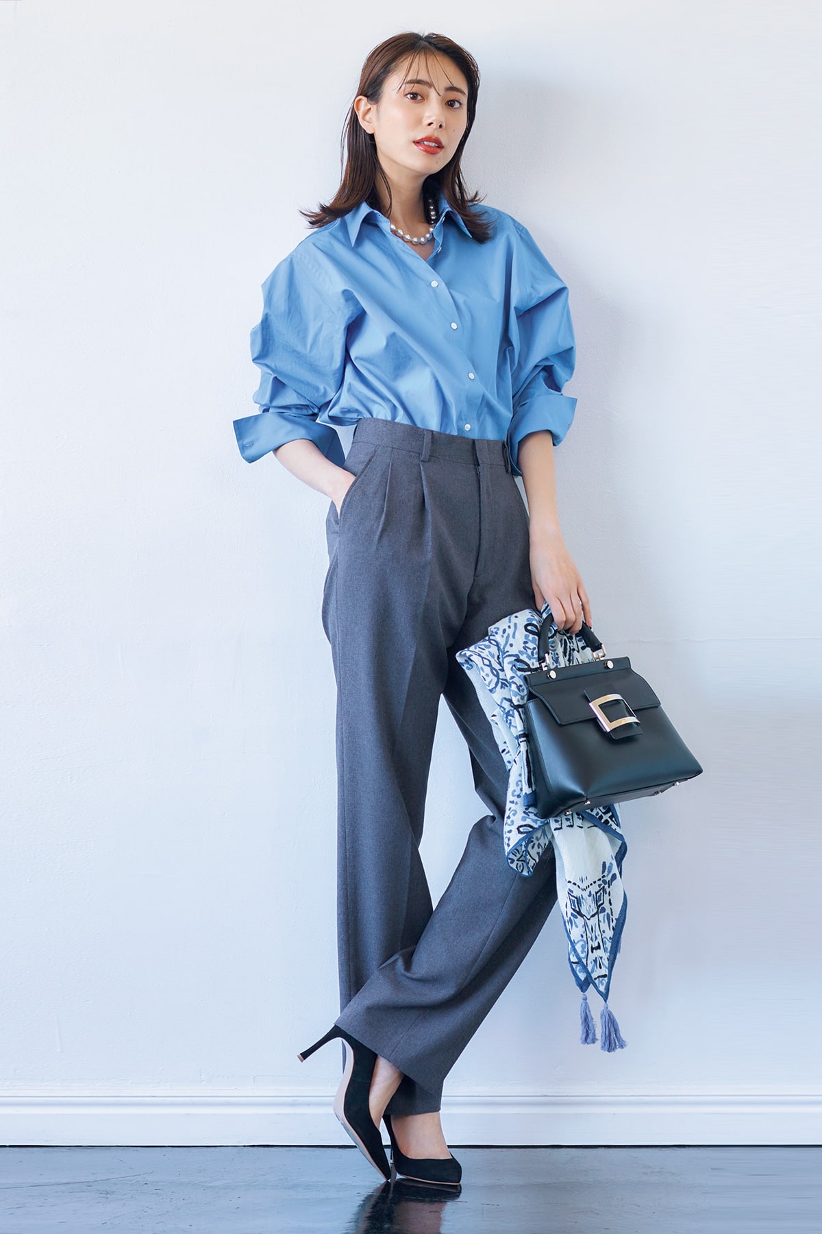 ラフにまくった袖とピンヒールでキリッとカッコよく。胸元のパールでレディな雰囲気も忘れずに。シャツ、パンツ※ともに着回し バッグ¥361,900(ロジェ ヴィヴィエ/ロジェ・ヴィヴィエ・ジャパン)バッグに付けたスカーフ¥16,500(マニプリ)パンプス¥34,100(ピッピシック/ベイジュ)ネックレス¥7,560(アビステ)