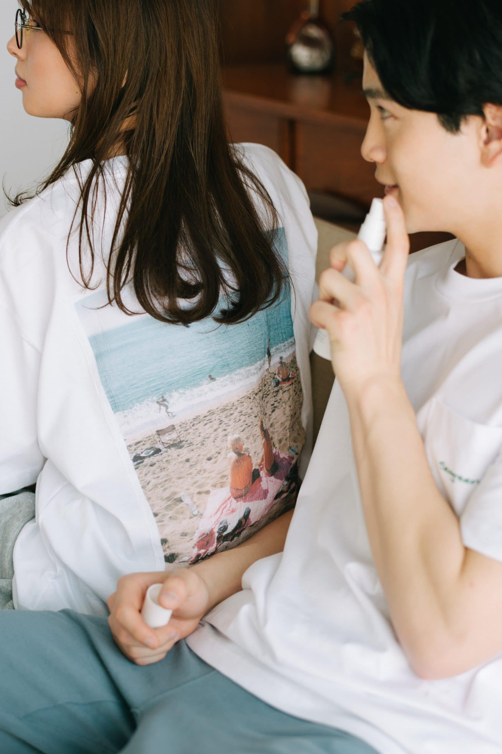 一見シンプルに感じる白のロゴTは、実は背中に一工夫。ただのプリントではなくガーゼ調の別地にプリントしたものを叩きつけている斬新なデザインで、ひとクセあって気分も上がります。センス感じるTシャツは二人のワードローブ入り確定。