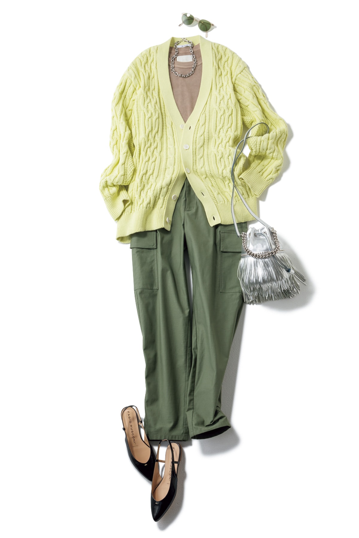 立体的な編み地がコーデに奥行きをプラスします。春らしく明るいイエローで鮮度高く。¥44,000(スローン) -