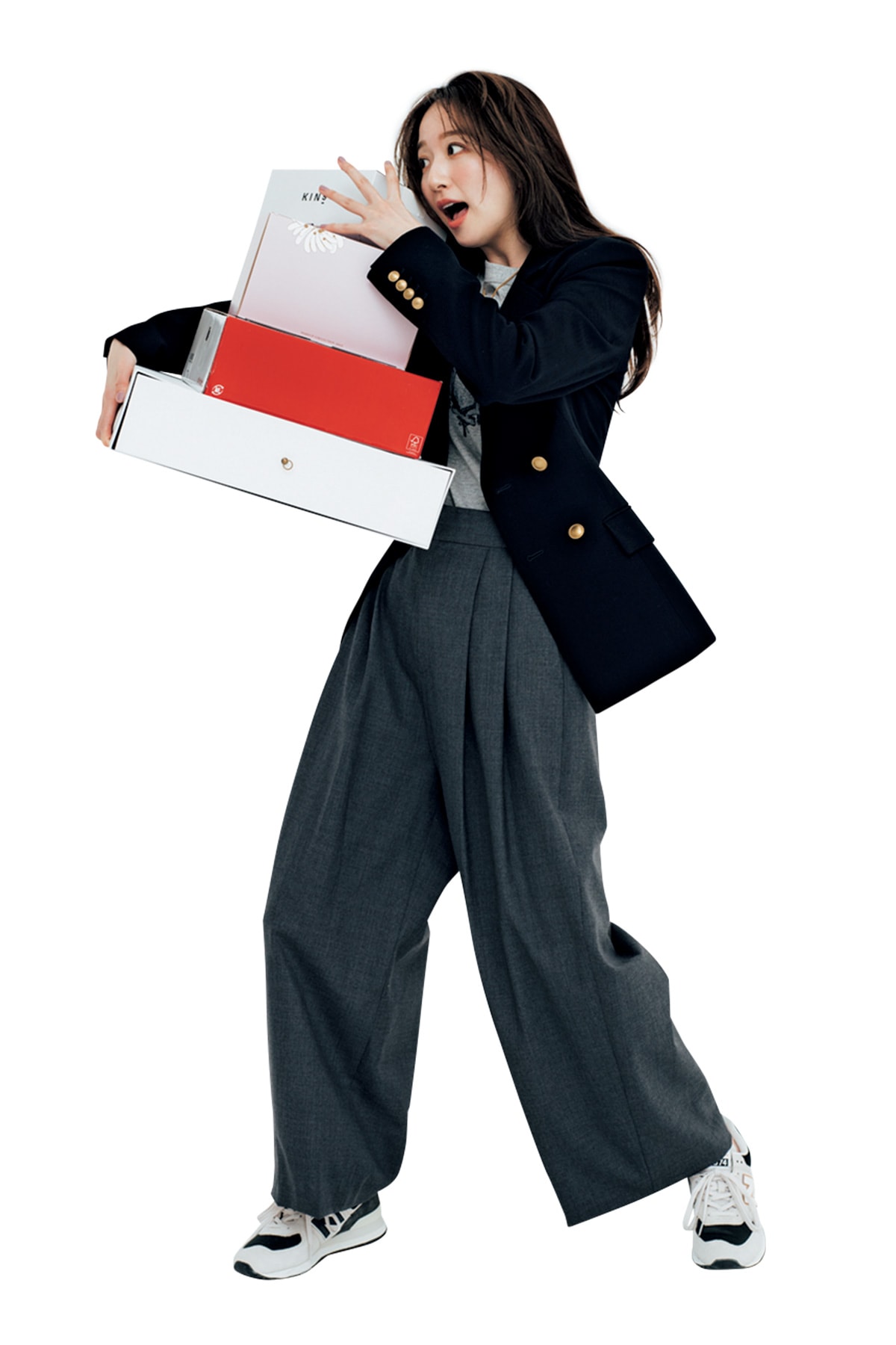 〝動きやすい服装で〟と言われたから、Tシャツ×スニーカーで出勤。キレイめパンツとジャケットをプラスすれば力仕事もできるオフィカジコーデに。でも、ちょっとこのあとジャケット脱ごう。撮影するコスメの量が多すぎる~。スニーカー¥11,990(ニューバランス/ニューバランス ジャパンお客様相談室)