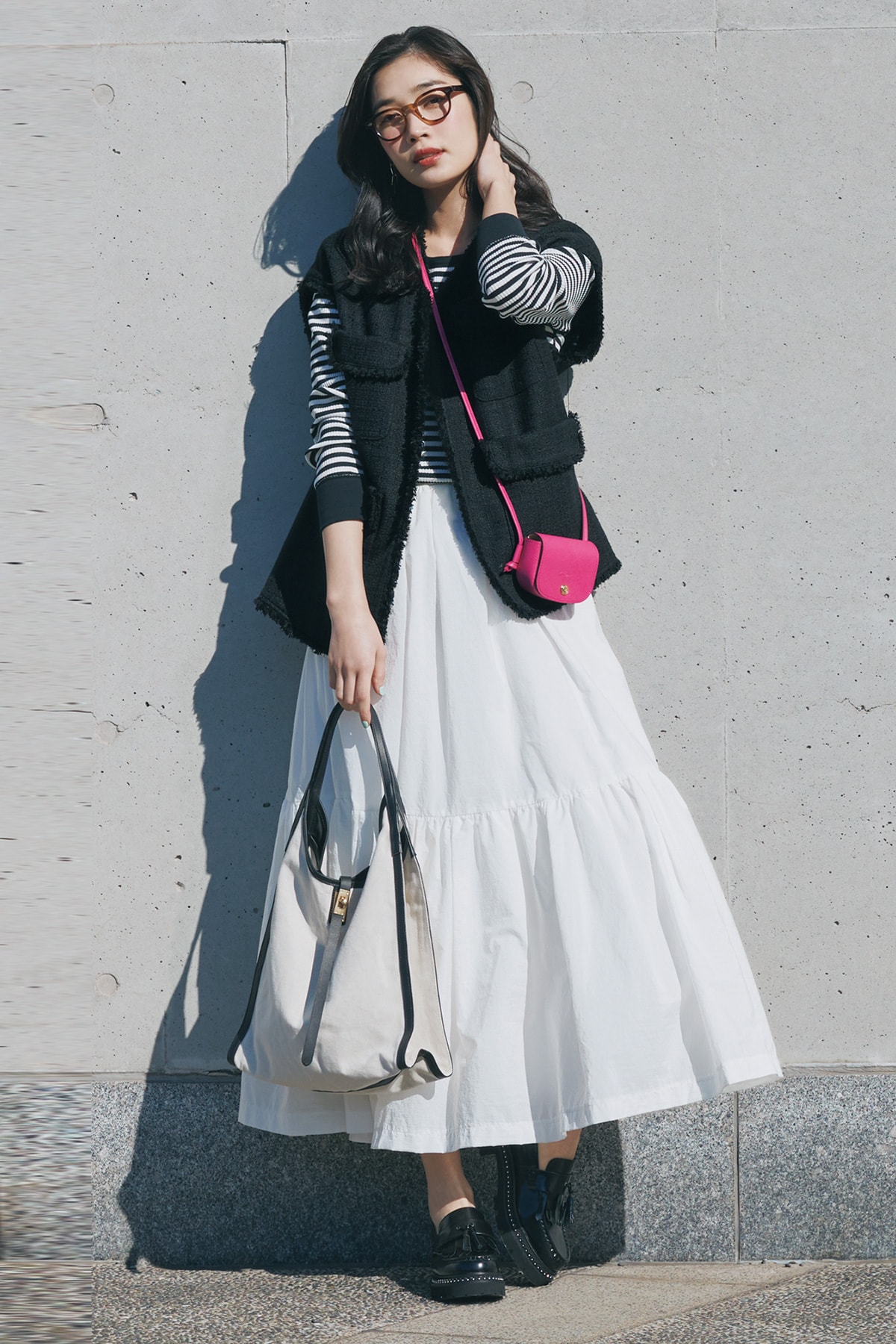 黒ツイードが持つ女性らしさがフレアスカートと相思相愛。ボーダーTや黒ローファーなどシンプルなモノトーンスタイルに、ビビッドなピンクを添えて甘口に仕上げて。ジレ¥46,200〈ハウント/ハウント代官山〉ボーダーカットソー¥14,300〈アッパーハイツ〉(ともにゲストリスト)スカート¥18,700(エミ/エミ ニュウマン新宿店)眼鏡¥42,900(モスコット/モスコット トウキョウ)ローファー¥26,400〈ユナイテッドアローズ〉トートバッグ¥29,700〈オルセットフォーユナイテッドアローズ〉(ともにユナイテッドアローズ 六本木ヒルズ店)ミニバッグ¥27,500(ロンシャン/ロンシャン・ジャパン)