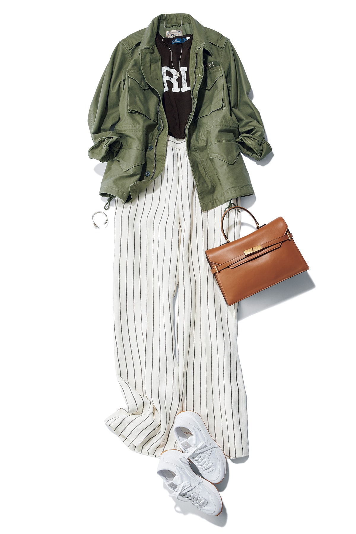 ミリタリーやワークなニュアンスを大人っぽく取り入れるなら、やっぱり〝ポロ ラルフ ローレン〟が秀逸。ラフさの中に洗練されたニュアンスが感じられるのは、ベースに宿るトラッドなスピリットによるものかも。着崩しても上品さをキープ。まさにCLASSY.が目指すカジュアル感が魅力です。ジャケット¥64,900Tシャツ¥14,300パンツ¥52,800バッグ¥97,900スニーカー¥18,700(すべてポロ ラルフ ローレン/ラルフ ローレン)ネックレス¥34,100バングル¥55,000リング[SV]¥30,800リング[GD]¥24,200(すべてヴァジック/ヴァジックジャパン