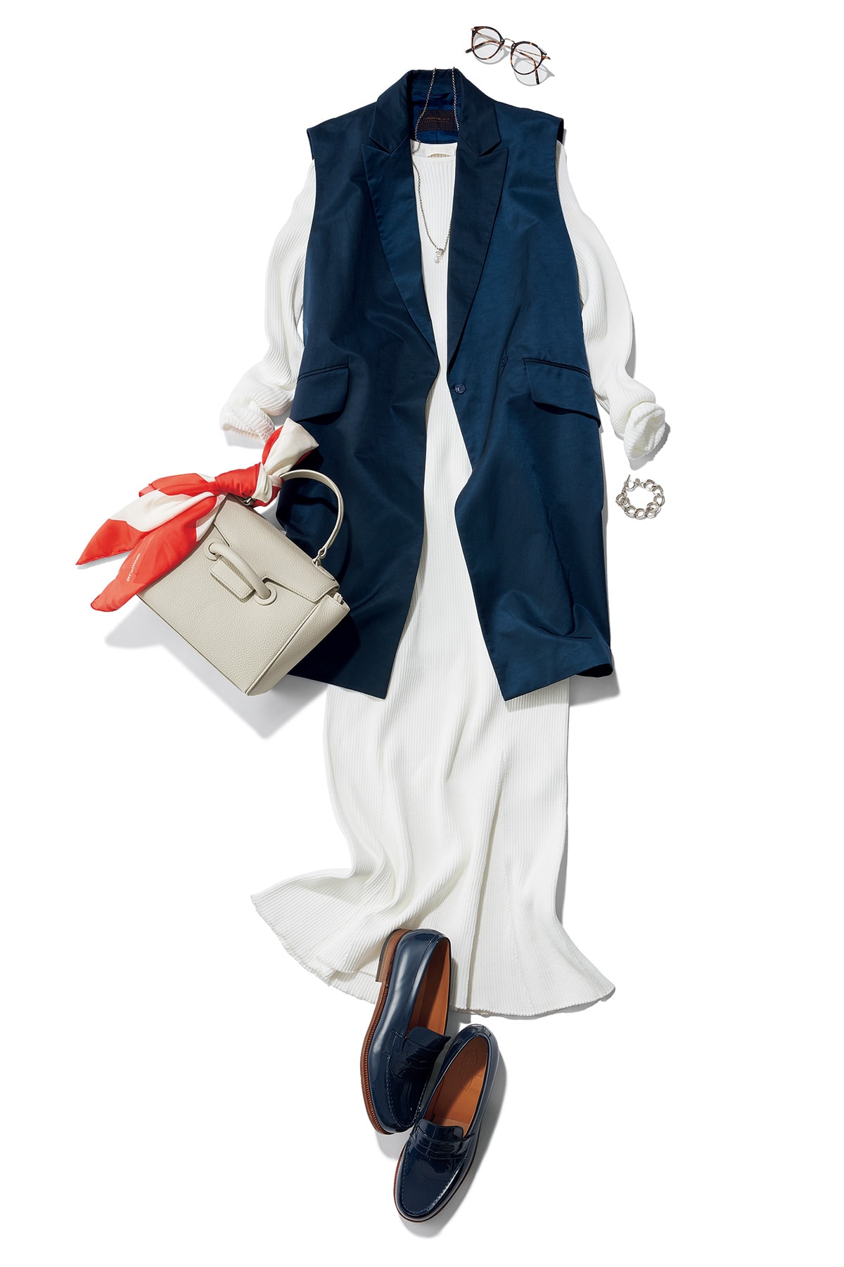 しなやかに、ハンサムに。生真面目に着ない白×ネイビーはブランドの真骨頂。ジレ¥44,000〈TOMORROWLAND collection〉ワンピース¥33,000〈Ballsey〉スカーフ¥19,800〈TOMORROWLAND〉ピアス¥14,300ネックレス¥16,500ブレスレット¥15,400〈すべてPHILIPPE AUDIBERT〉(すべてTOMORROWLAND)バッグ¥52,800(ヴァジック/ヴァジックジャパン)ローファー¥137,500(ジェイエムウエストン/ジェイエムウエストン 青山店)メガネ¥39,600(アイヴァン/アイヴァン 東京ギャラリー)