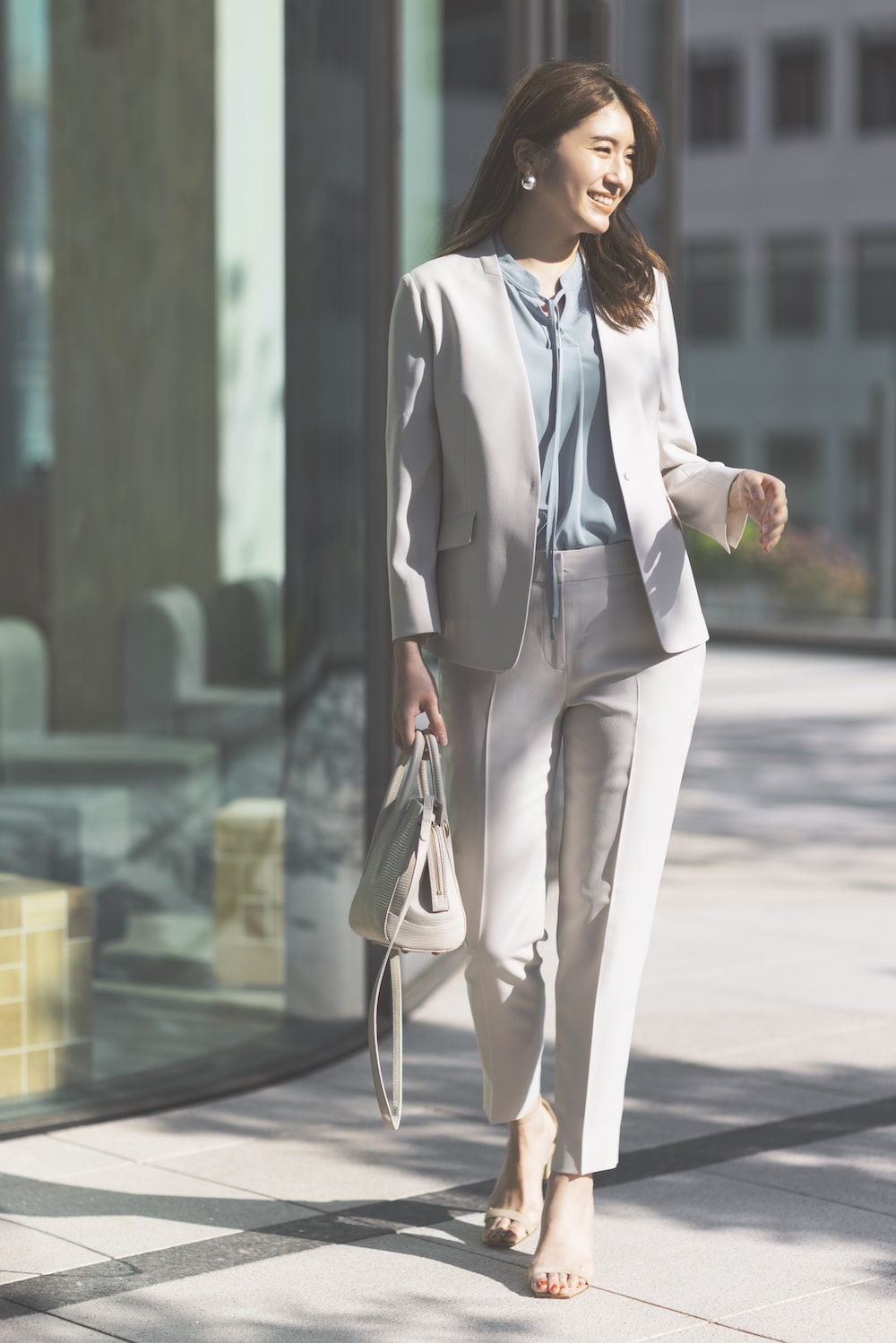 さわやかなライトグレーのセットアップは、ストライプのインナーを合わせてキリッと知的に。フォーマル感の中にも洒落感のある通勤スタイルを完成させて。ジャケット¥17,600 ※5月11日納品予定 パンツ¥9,900 ※5月11日納品予定 ブラウス¥5,390ベルト¥4,290(すべてオリヒカ/オリヒカ池袋東口店)バッグ¥49,500(トフ&ロードストーン/T&L)パンプス¥17,600(ダイアナ/ダイアナ 銀座本店)時計¥16,500(クルース/HIROB ルミネ新宿店)ピアス¥15,290(チビ・ジュエルズ/チビジュエルズ・ジャパン)