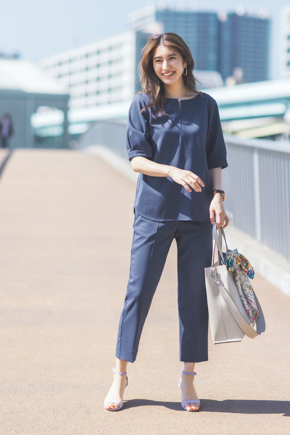 知的なブルーはカジュアルになりがちな夏にぴったり。着るだけでコーディネートが成立するのもうれしい! 胸元のメタルバーでアクセ要らずの華やぎ感も。ブラウス¥5,390パンツ¥8,690バッグ¥6,490(すべてオリヒカ/オリヒカ池袋東口店)スカーフ¥14,300(マニプリ)サンダル¥53,900(ネブローニ/フラッパーズ)ピアス¥22,220(ソコ/ZUTTOHOLIC)時計¥22,990(クルース/HIROB ルミネ新宿店)