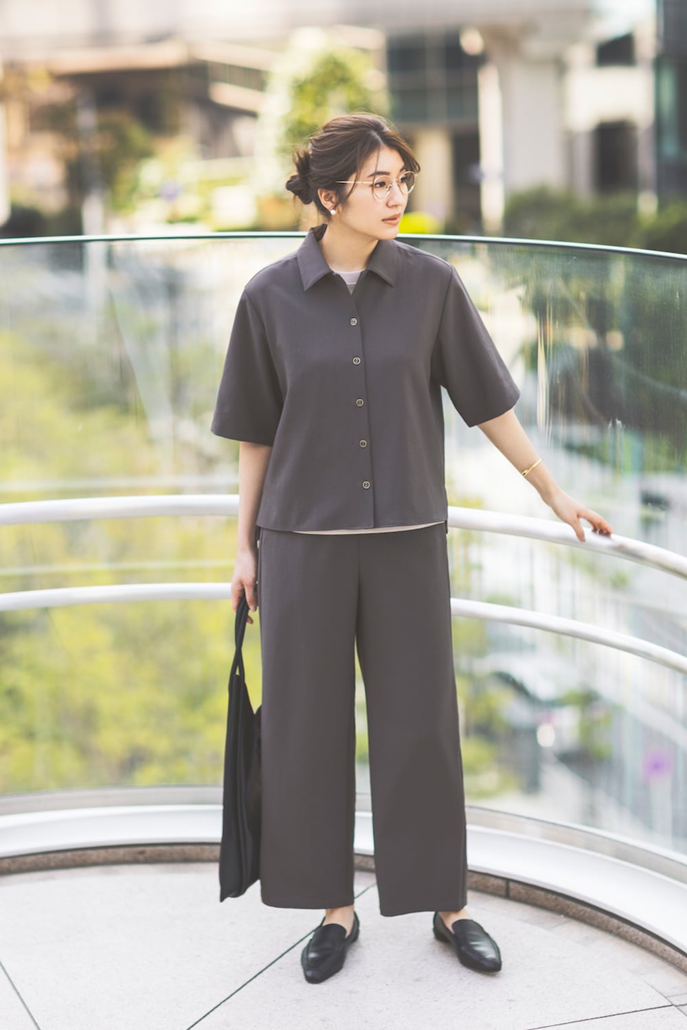 メンズライクなセットアップは、ボタンをいちばん上まで留めてもよし、スキッパー仕様にしてもよしの2wayタイプ。一枚で着てもいいし、インナーと合わせてレイヤードするのもおすすめ。シャツカラーブラウス¥5,390 ※5月12日納品予定 パンツ¥8,690 ※5月11日納品予定 Tシャツ¥4,290(すべてオリヒカ/オリヒカ池袋東口店)バッグ¥6,930(カシュカシュ/アンビリオン)シューズ¥28,600(シーセイ/アイネックス)メガネ¥44,000(アイヴァン/アイヴァン 東京ギャラリー)ピアス¥3,520〈フル・オブ・グレイス〉バングル¥22,330〈ソコ〉(ともにZUTTOHOLIC)