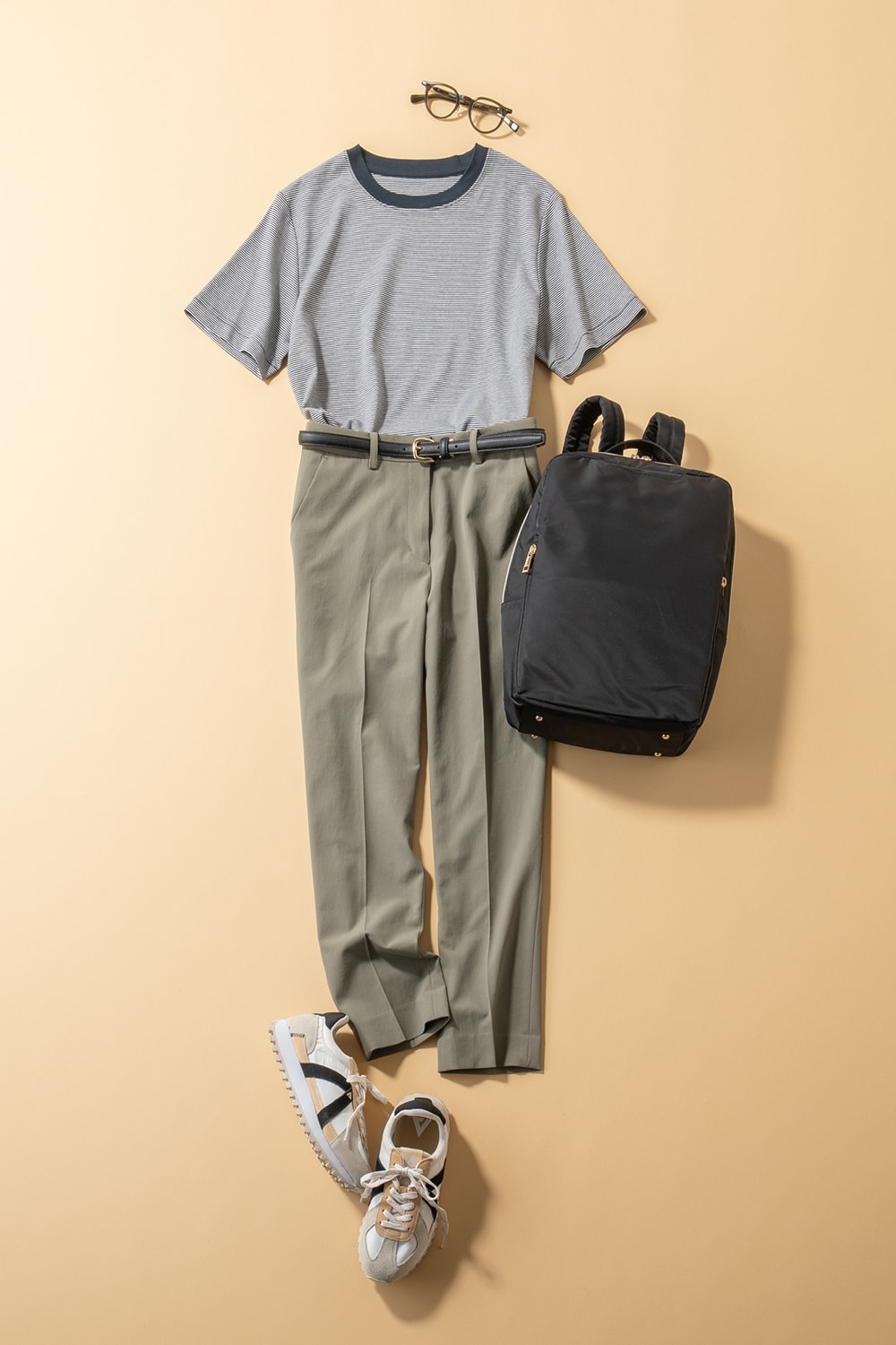 こちらは定番のテーパードタイプの新色! 防透け&UVカットなど、機能性も申し分なし。カジュアルDayはリュックとスニーカー合わせもいい感じ。パンツ¥7,590 ※5月11日納品予定 Tシャツ¥4,290ベルト¥4,290リュック¥7,590(すべてオリヒカ/オリヒカ池袋東口店)スニーカー¥14,850(アスファルト/アースマーケティング)メガネ¥44,000(アイヴァン/アイヴァン 東京ギャラリー)