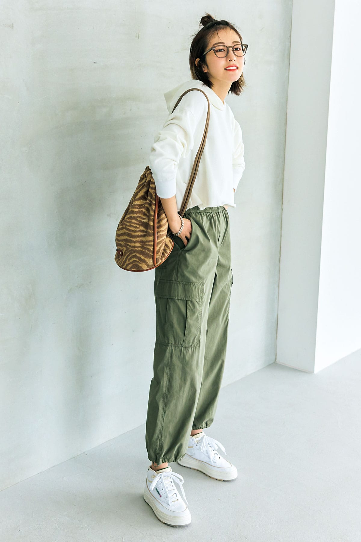 トレンドのクロップト丈のフーディと合わせたヘルシーな着こなし。ハイウエスト×短め丈が視線を上に集めるので、スタイルアップ効果も。足元は真っ白スニーカーでクリーンにまとめて、アクティブな休日コーデも品よく仕上げて。カーゴパンツ¥3,990(UNIQLO)フーディ¥18,700(テンドレ/プラージュ 代官山店)バッグ¥41,800(ア ヴァケーション/ノーベルバ)ハイカットスニーカー¥12,100(Reebok)メガネ¥36,300(アイヴァン/アイヴァン 東京ギャラリー)ブレスレット¥8,800(イン ムード/フォーティーン ショールーム)