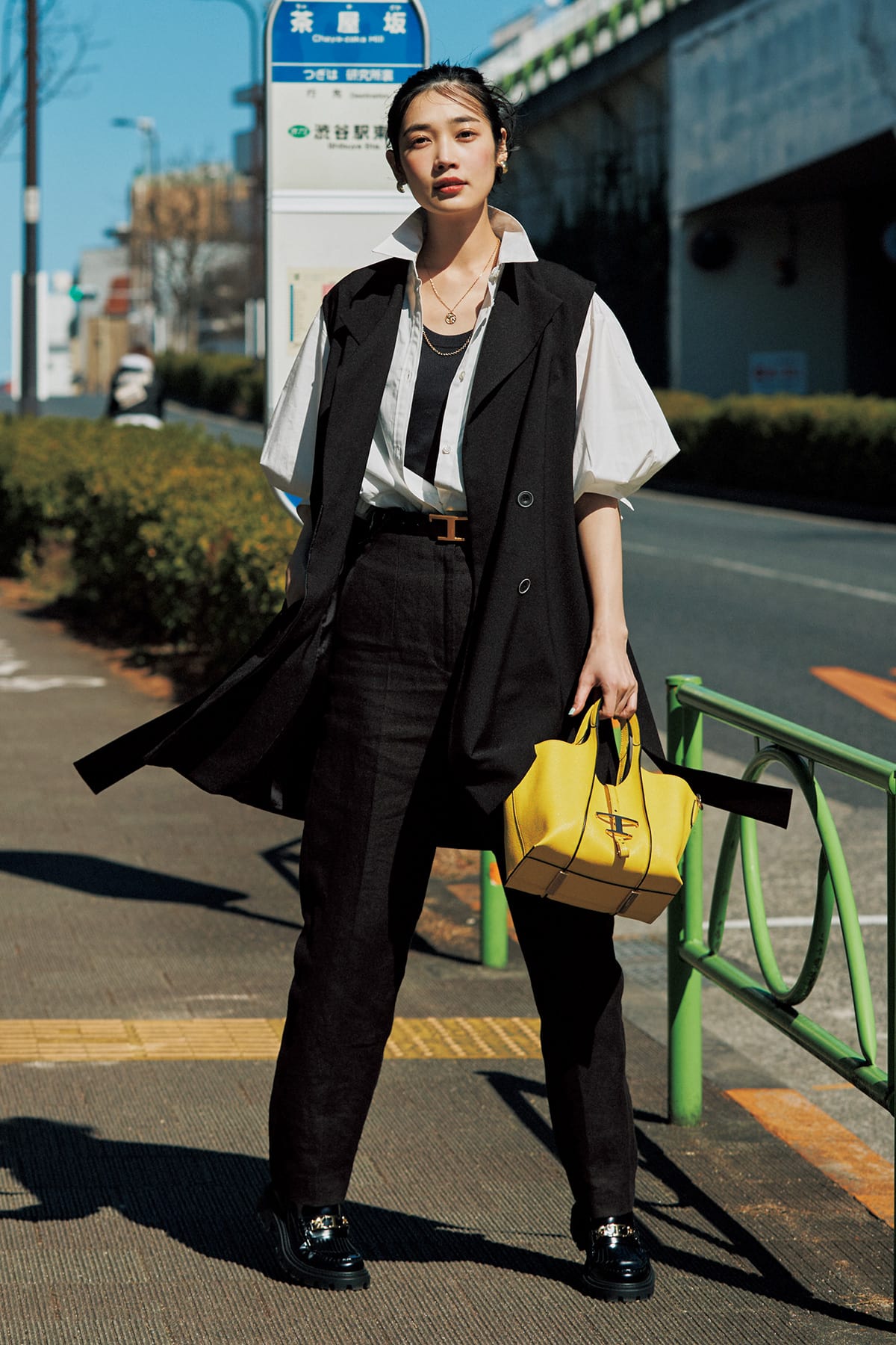 シャツは大胆に前を開けて着崩し、袖をクシュッとさせて幅を出すと〝制服みたい〟を回避できる。ネックレスのレイヤードやバックルが目立つベルトでメリハリを。ジレ¥20,900(カデュネ プレスルーム)シャツ¥19,800(ガリャルダガランテ/ガリャルダガランテ 青山店)タンクトップ¥14,300〈ゲミニー〉パンツ¥36,300〈ウィム ガゼット〉(ともにウィム ガゼット ルミネ新宿店)チェーンネックレス[60㎝]¥24,200コインネックレス[45㎝]¥19,800(ともにマリハ)ピアス¥11,000(ワンエーアールバイウノアエレ/ウノアエレ ジャパン)ベルト¥68,200 ローファー¥106,700 バッグ¥198,000(すべてトッズ/トッズ・ジャパン)