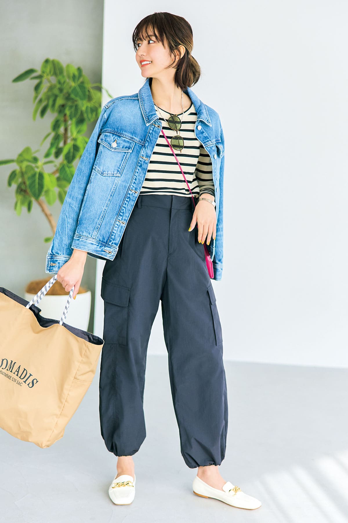 カーゴパンツ¥18,700(エミ/エミ ニュウマン新宿店)Gジャン¥19,800(トミー ヒルフィガー/トミー ヒルフィガー カスタマーサービス)ボーダーカットソー¥15,400(トラディショナル ウェザーウェア/トラディショナル ウェザーウェア ルミネ有楽町店)ショルダーバッグ¥19,250(ヤーキ/ヤーキ オンラインストア)トートバッグ¥15,400(ノマディス/アダム エ ロペ)ローファー¥33,000(ファビオ ルスコーニ/WASH ルミネ横浜店)サングラス¥11,100(ゾフ/ゾフ カスタマーサポート)ネックレス¥187,000(ウノアエレ/ウノアエレ ジャパン)バングル¥25,300(フィリップ・オーディベール/アルアバイル)