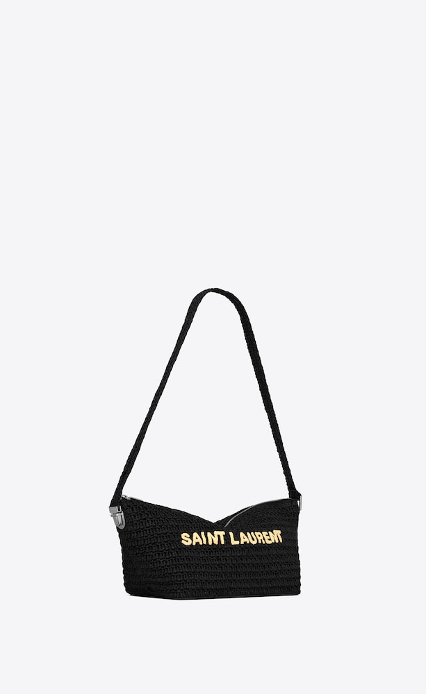モダンなブラックカラーを使用したクロシェ編みのラフィア素材に、SAINT LAURENTシグネチャーロゴをベージュナチュラルカラーで配し、シックな装いでデザインされた「ル・ラフィア」ボディバッグ。ショルダーストラップ部分には同じくシグネチャーロゴを刻印したプッシュロックボタンを採用。スマートかつスタイリッシュに着脱でき、涼しげでリラックスした雰囲気の中に洗練された印象を感じさせます。