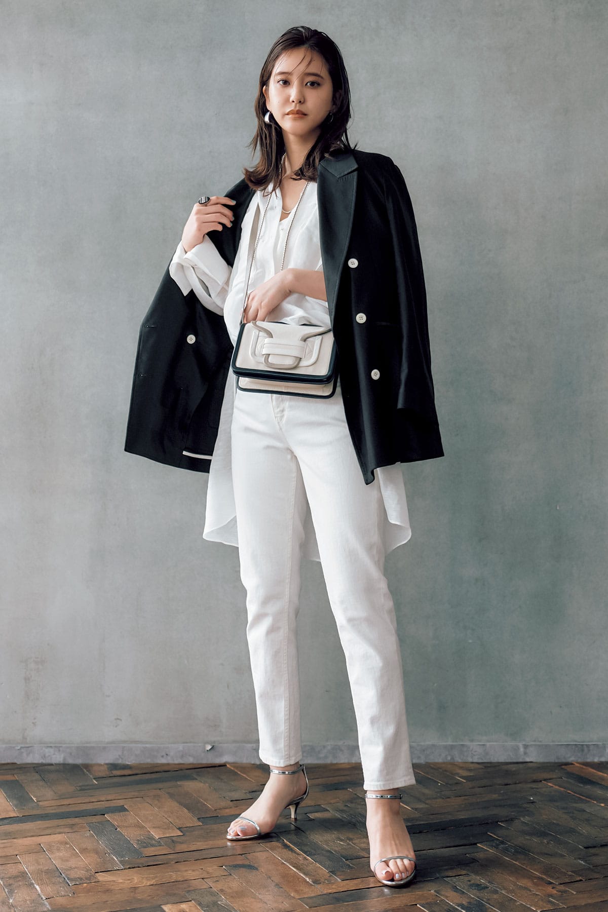 デコルテや足首を見せることでジャケット&シャツを軽やかに。春のモノトーンは白の分量が多いと爽やかです。ジャケット¥74,800シャツ¥52,800(ともにカオス/カオス丸の内)パンツ¥25,300(ヤヌーク/カイタックインターナショナル)ネックレス¥46,200(インディアン ジュエリー/ロンハーマン)ピアス¥8,800〈ワンエーアールバイウノアエレ〉リング[左手]¥28,600〈ウノアエレシルバーコレクション〉(ともにウノアエレ ジャパン)リング[右手]¥17,600(アダワットトゥアレグ)サンダル¥57,200(ネブローニ/フラッパーズ)バッグ¥137,500(ピエール アルディ/ピエール アルディ 東京)