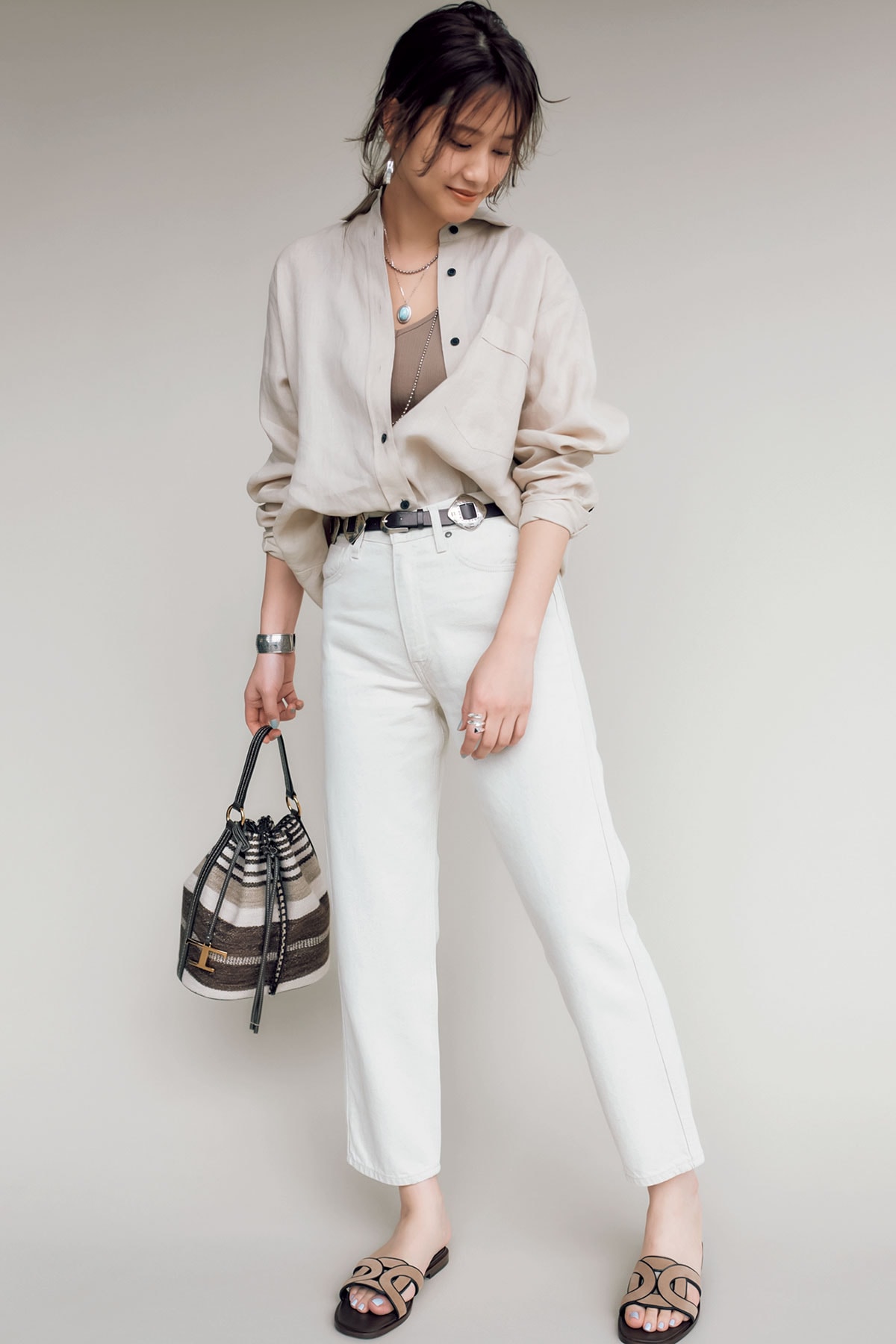 小物やインナーで濃淡をつければ、リラックス感があるのに間伸びしません。シャツ¥18,700(トミー ヒルフィガー/トミー ヒルフィガー カスタマーサービス)タンクトップ¥8,580(ティッカ)パンツ¥24,200(リーバイス® メイド アンド クラフテッド®/リーバイ・ストラウス ジャパン)コンチョベルト¥28,600(アトリエ アンボワーズ/アマン) ネックレス[長]¥46,200ネックレス[短]¥55,000(ともにマリハ)ピアス¥13,200リング¥16,500(ともにワンエーアールバイウノアエレ/ウノアエレ ジャパン)バングル¥59,400(アダワットトゥアレグ)サンダル¥80,300バッグ¥229,900(ともにトッズ/トッズ・ジャパン)