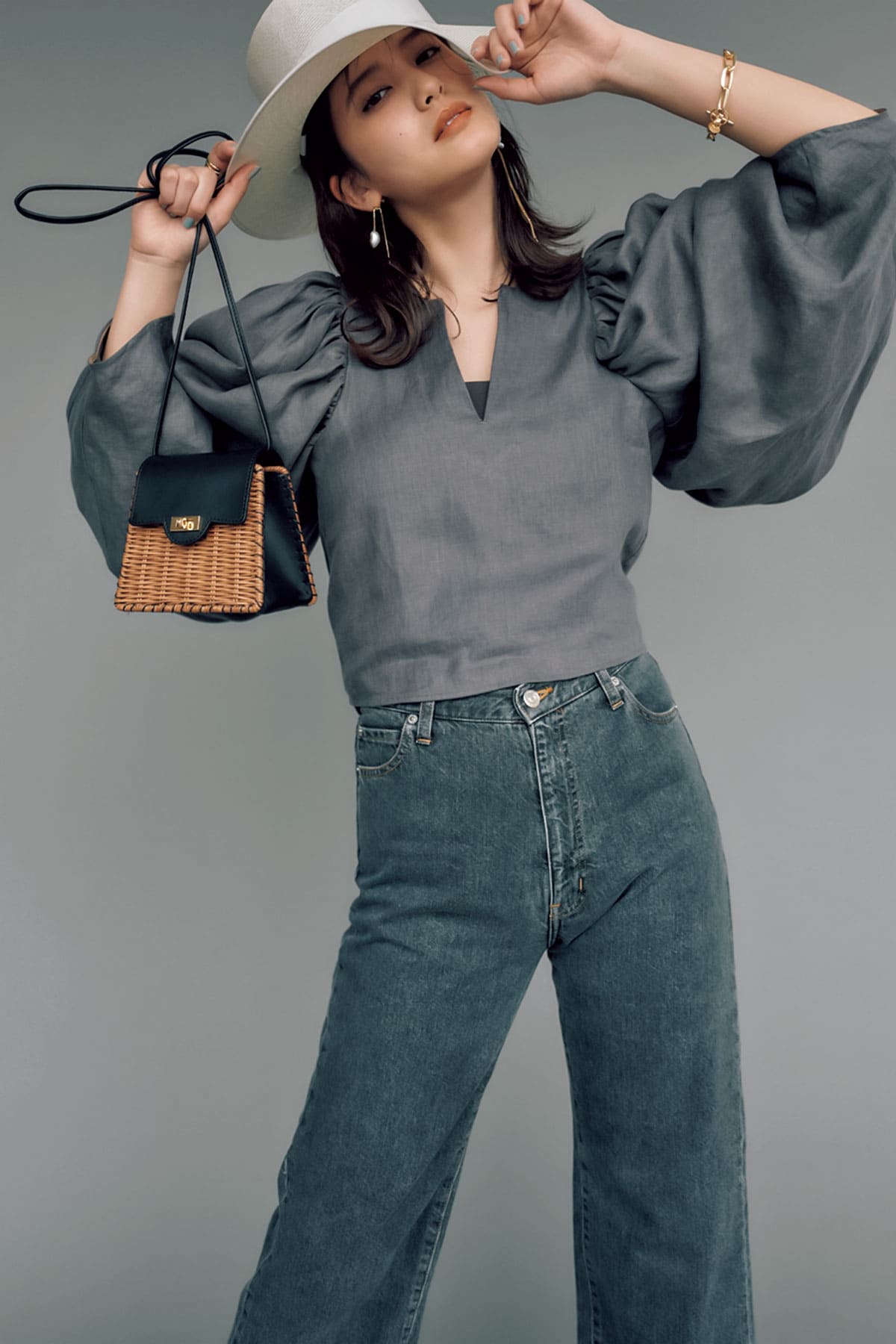 ボリュームのあるロマンチックなパフブラウスは、ピリッと締まるグレーデニムで受け止めて大人の甘口スタイルに。服がシックなら小物で遊びを加えてバランスよく!ブラウス¥42,900 キャミソール¥9,900(ともにカオス/カオス丸の内) パンツ¥29,700(THIRD MAGAZINE/THIRD MAGAZINE) ハット¥69,300(エントワフェイン) ピアス[左]¥60,500 バーピアス[右]¥53,900(ともにマリハ) ブレスレット¥12,100 リング¥11,000(ともにワンエーアールバイウノアエレ/ウノアエレ ジャパン) バッグ¥20,900(バクマティ/シップス インフォメーションセンター)