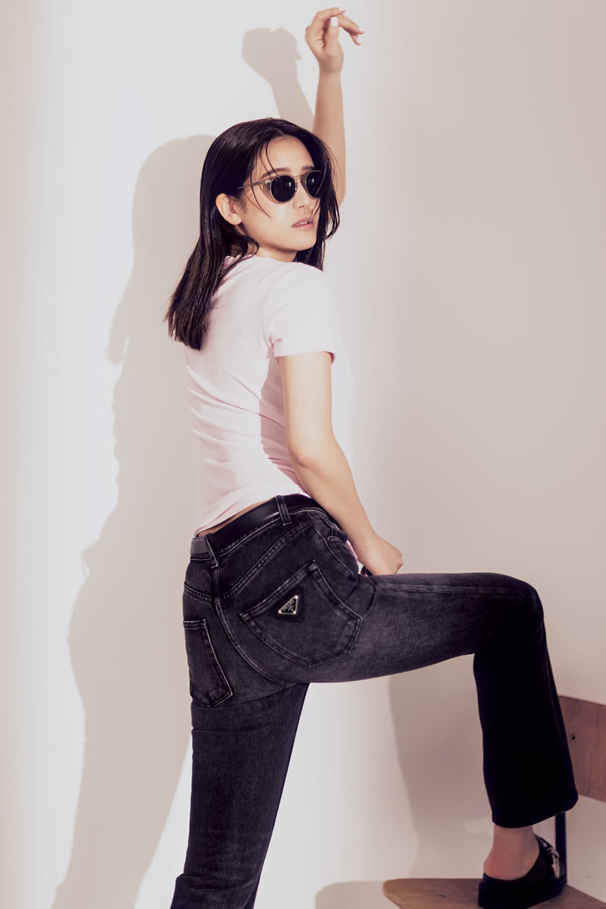 フレアデニム¥144,100予定価格(プラダ/プラダ クライアントサービス)カットソー¥13,200(ジェームス パース/ジェームス パース 青山店)ベルト¥20,900(アトリエ アンボワーズ/シップス インフォメーションセンター)サングラス¥40,260(オリバーピープルズ/ルックスオティカジャパン カスタマーサービス)靴¥75,900(トーガ プルラ/ビューティ&ユース ユナイテッドアローズ 丸の内店)