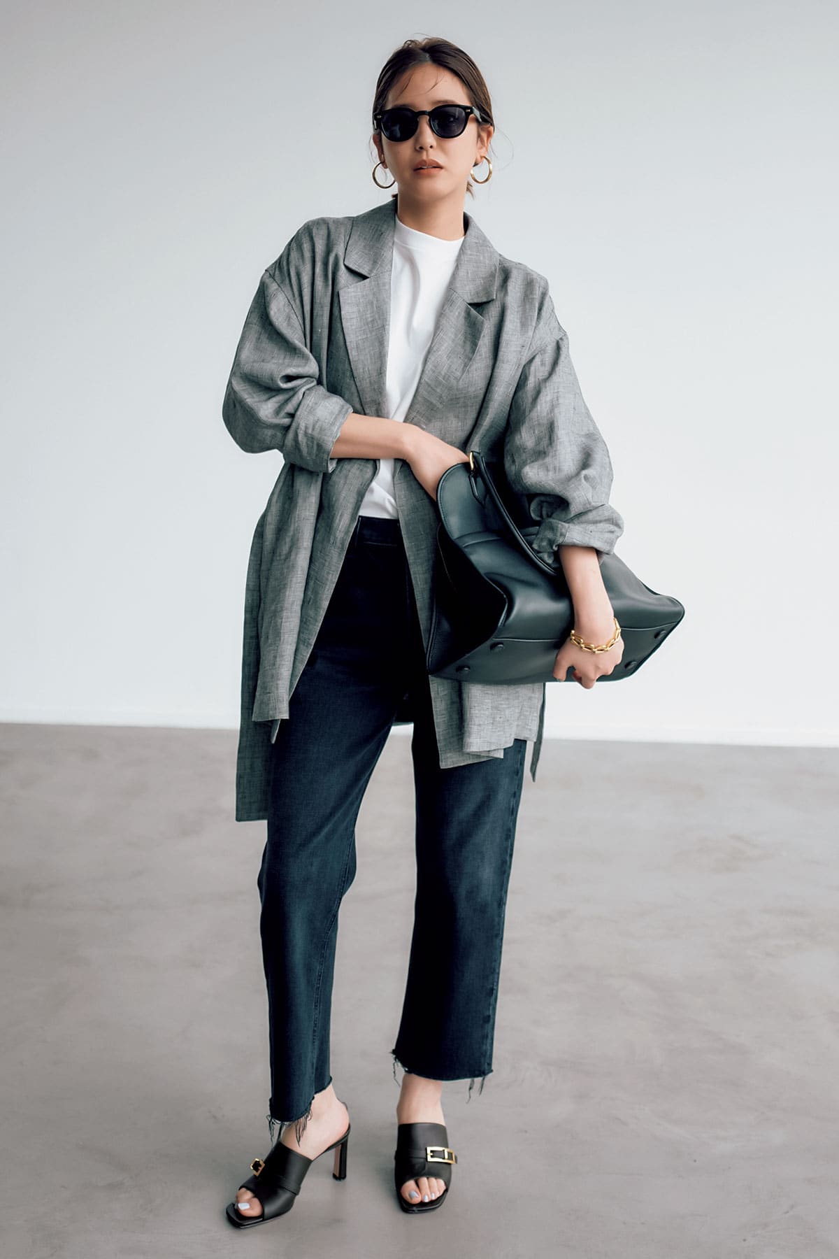 切りっぱなしデニムがこなれ感を後押し。ジャケット¥79,200(カオス/カオス丸の内)Tシャツ¥15,400(エイトン/エイトン青山)パンツ¥42,900(シチズンズ・オブ・ヒューマニティ/シチズンズ・オブ・ヒューマニティ)サングラス¥44,000(アイヴァン/アイヴァン東京ギャラリー)イヤリング¥9,450 ブレスレット¥7,350(ともにアビステ)サンダル¥119,900(セルジオ ロッシ/セルジオ ロッシ カスタマーサービス)バッグ¥264,000(J&M デヴィッドソン/J&M デヴィッドソン カスタマーセンター)