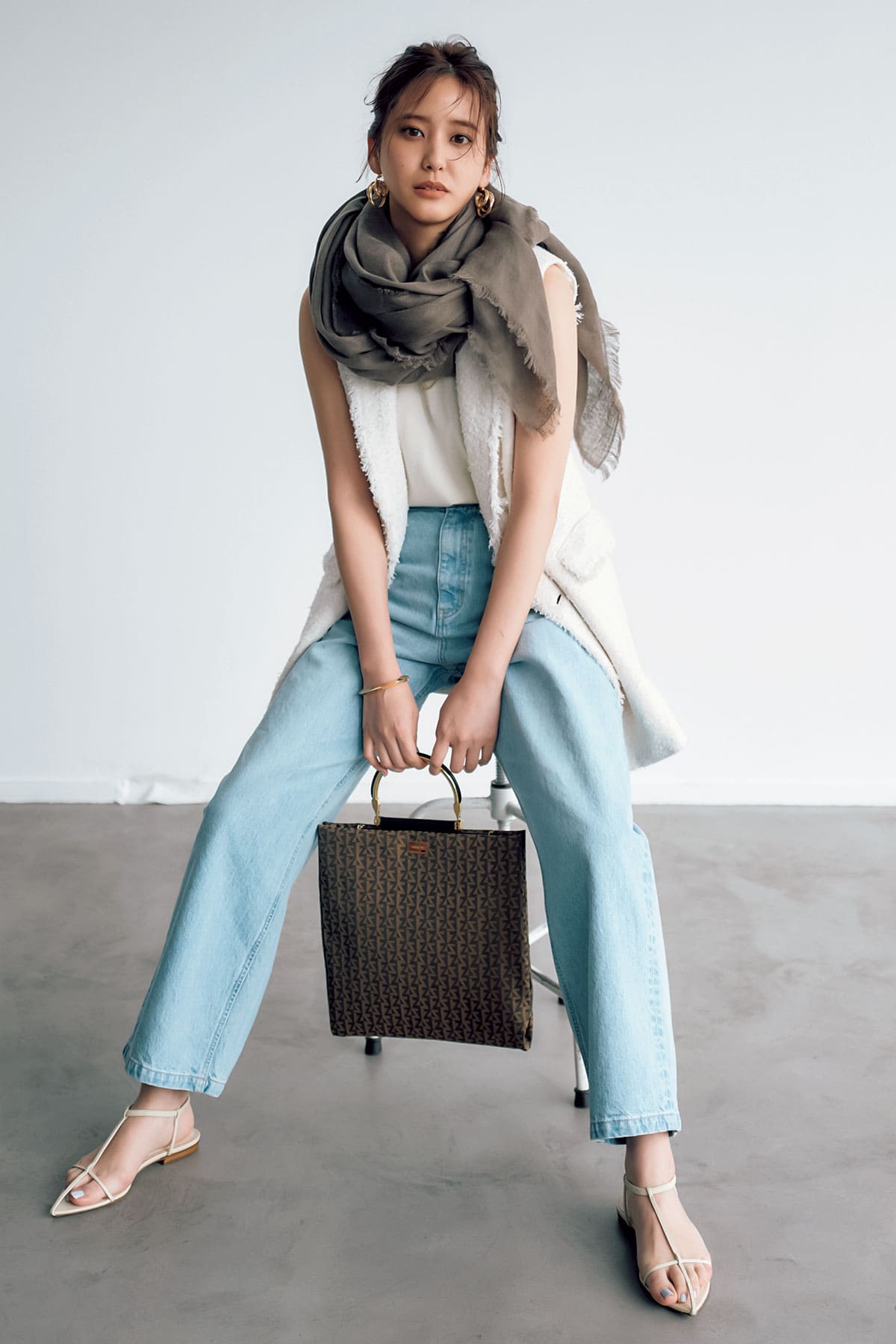 かわいい要素のツイードジレを、軽やかでハンサムな淡色ブルーデニムで好バランスに。ジレ¥26,400(アルページュストーリープレスルーム)ニット¥25,300(エブール フォー ロンハーマン/ロンハーマン)パンツ¥20,900(MIESROHE)ストール¥29,700(スロー/RHC ロンハーマン)ネックレス¥24,200(マリハ)ピアス¥12,100 バングル¥28,600(ともにワンエーアールバイ ウノアエレ/ウノアエレ ジャパン)サンダル¥46,200(ブレンタ/シップス インフォメーションセンター)バッグ¥143,000(ザンケッティ/八木通商)