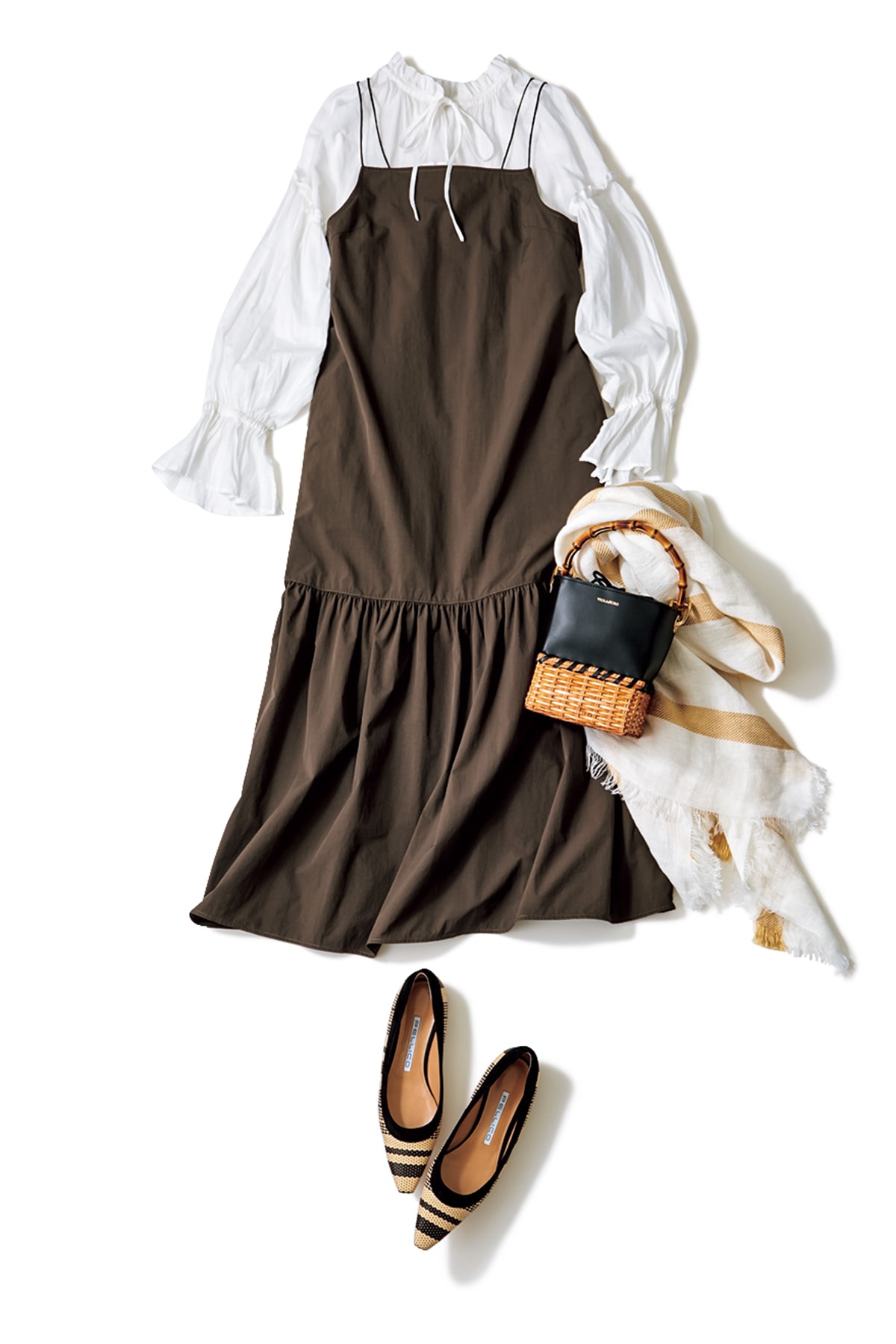 カジュアル好きに欠かせないブランドのひとつ。レイヤードでも一枚でも着られるキャミワンピは大人っぽく仕上がるブラウンを選択。¥9,900(ビーミングby ビームス/ビーミング ライフストアby ビームス ららぽーとTOKYO-BAY店) -