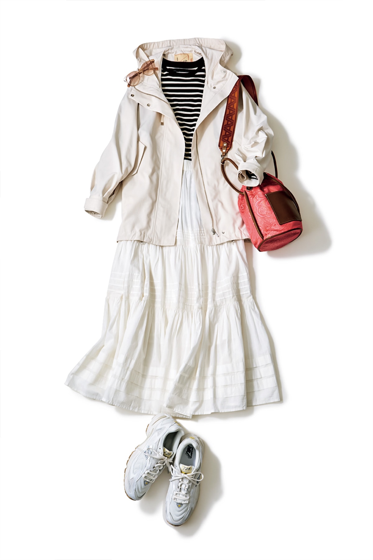 撥水防風機能つきで、梅雨の季節や軽いアウトドアシーンでも頼れる一枚。オフホワイトならカジュアル感が軽減されるので、通勤シーンにもなじみます。¥18,700(ナノ・ユニバース/ナノ・ユニバース カスタマーサービス)