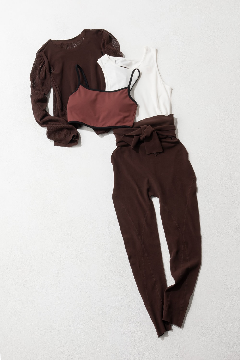 4wayで着用できる長袖のメッシュトップスと、ウエスト部分のディテールがおしゃれなレギンスが、日本のコレクションブランド<Chika Kisada>とのカプセルコレクション。バレエの経験のあるデザイナーならではの体のラインや動きがキレイに見えるデザインが特徴です。トップスは前後逆にしても着用でき、さらにアームホールの脇の部分から腕を出してノースリーブとして着てもOK。レギンスのウエストベルトは、フロントやサイドなど好きな位置でアクセントに。ハイウエストデザインなのでショート丈トップスと合わせるとバランスよくまとまります。パイピングがヘルシーなブラは、ヨガやワークアウトはもちろん、スイムウェアとしても使える万能アイテム。