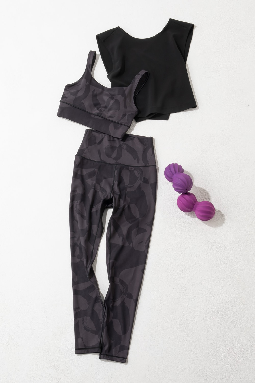 シックなモノトーンのブラ×レギンスは、エネルギーのある草木からインスピレーションを受けたプリント柄がポイント。胸下の太めベルトのおかげで安定感&フィット感がバツグンのブラは、ハイウエストのレギンスと合わせることで露出少なく、いっそうスタイリッシュに。ライトなヨガからハードなトレーニングまで幅広いワークアウトで使えるデザインです。トップスは前後入れ替えて使える2WAY仕様。クルーネックとカシュクールを気分によって楽しめます。