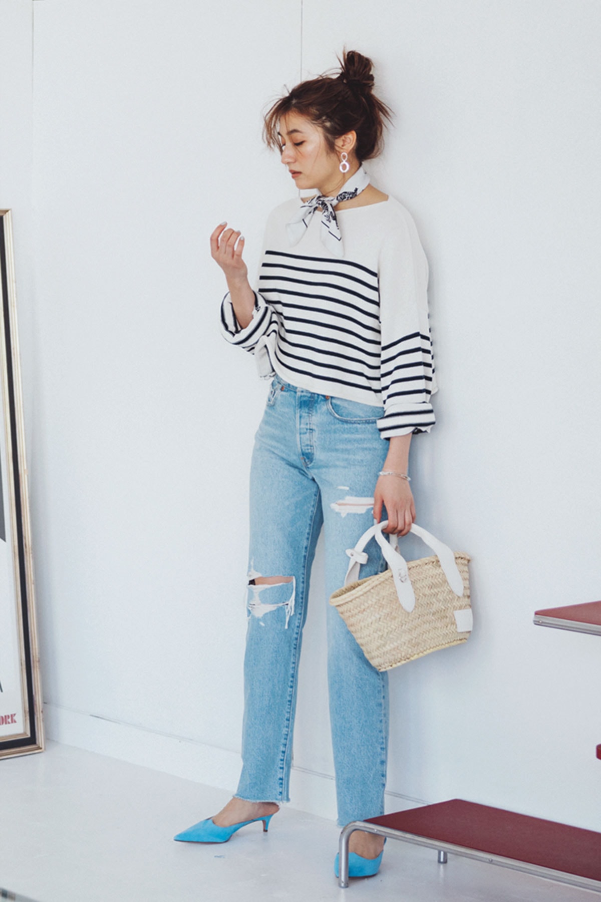 デニムパンツ¥17,600(リーバイス®/リーバイ・ストラウス ジャパン)ニット¥14,850(TRICOTS JEAN MARC/ジャーナル スタンダード レサージュ 丸の内店)バッグ¥69,300(J&M デヴィッドソン/J&M デヴィッドソン カスタマーセンター)シューズ¥57,200〈ペリーコ〉スカーフ¥9,790〈フラード〉(ともにアマン)ピアス¥11,000 バングル¥28,600(ともにワンエーアールバイウノアエレ/ウノアエレ ジャパン)