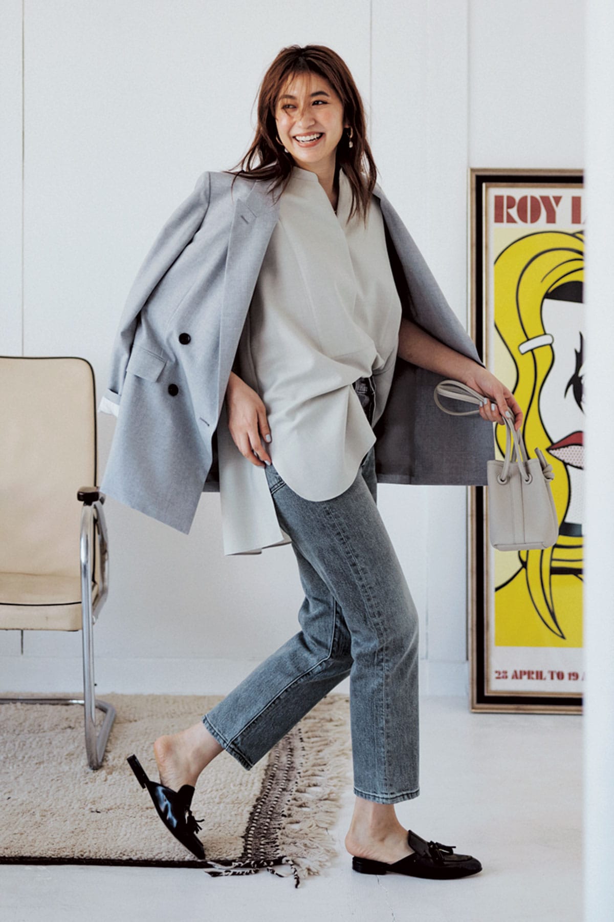 ハイライズ&クロップト丈ですっきりとスタイルよくはけるシルエット。デニムパンツ¥15,400(リーバイス®/リーバイ・ストラウス ジャパン)ジャケット¥72,600 ブラウス¥36,300(ともにebure/ebure GINZA SIX店)バッグ¥41,800(ヴァジック/ヴァジックジャパン)シューズ¥35,200(カステラーノ×デミルクス ビームス/デミルクス ビームス 新宿)ピアス¥7,700(オクト)