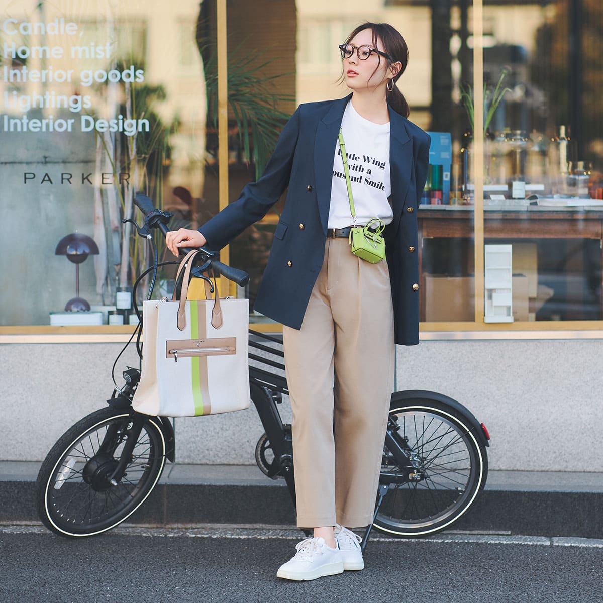 自転車移動の日はチノパン+スニーカーに紺ジャケ投入でキレイめに