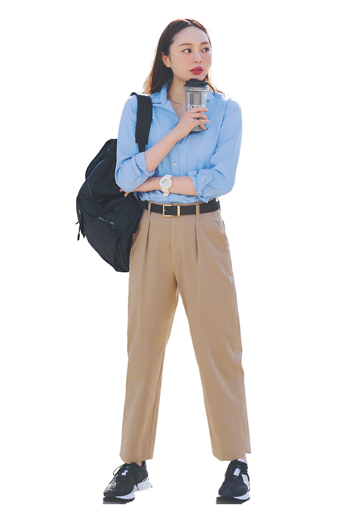 トラッドなシャツ×パンツにスポーティな味付けが今っぽい!シャツ¥36,300(フランク&アイリーン/サザビーリーグ)ベルト¥15,400(アルアバイル)バックパック¥64,900(マッキントッシュ×ポーター/マッキントッシュ ギンザシックス店)スニーカー¥13,090(ニューバランス/ニューバランス ジャパンお客様相談室)ネックレス¥9,350(ココシュニック オンキッチュ/ココシュニック)時計¥16,500(ジーショック/カシオ計算機 お客様相談室)