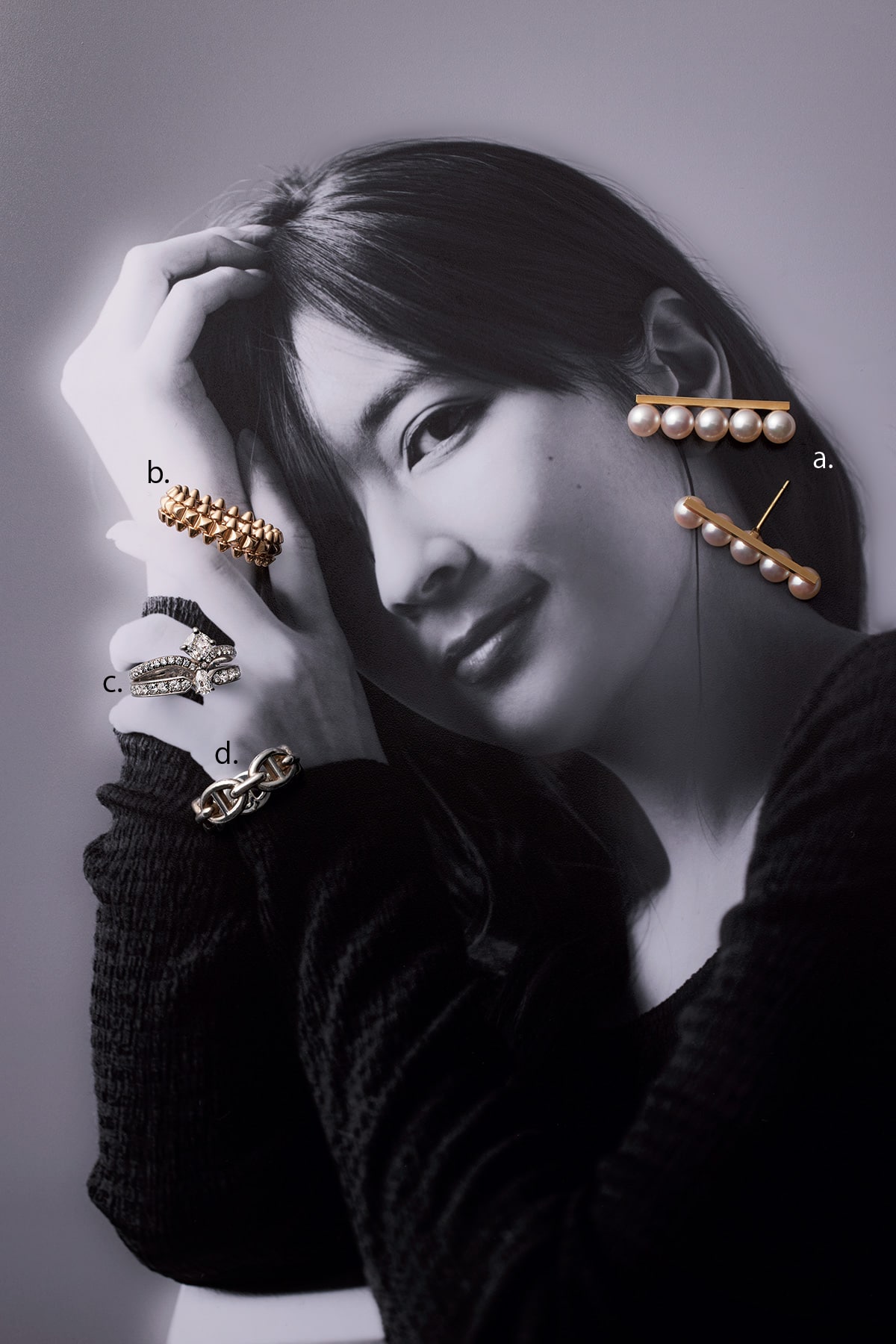 a.よりファッション感覚で楽しめる等身大パール。身につけるだけで顔周りが一気に華やかに。カジュアルにもフォーマルにも使える優れもの。タサキのバランスプラス イヤリング b.ハードなスタッズデザインとカルティエらしい上品さのバランスが絶妙。存在感抜群で歳を重ねてもカッコよくつけられる一生モノリング。クラッシュ ドゥ カルティエリング c.「指先にもティアラを」という思いから生まれたリング。純白で控えめな輝きショーメのダイヤの魅力。ショーメのジョゼフィーヌコレクション エクラリング d.ニュートラルだけど一癖あるデザインでどんなアイテムにも馴染む。エルメスのシェーヌ・ダンクル アンシェネリング