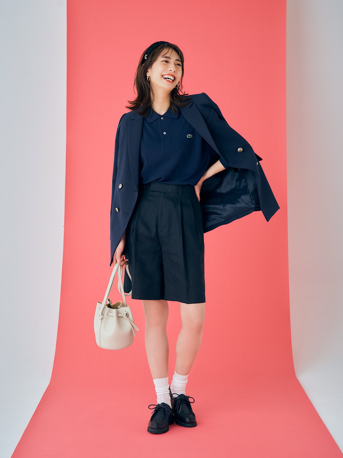 紺ブレ+ハーフパンツのトラッドコーデに、スポーティなポロシャツを投入。あえてシャツの代わりに投入することで、真面目すぎず、カジュアルな抜け感を演出できます。足元はキレイめに履ける白のリブソックスとローファーで、なつかしの制服ライクにまとめるのが可愛い。仕上げに太めのカチューシャを合わせれば、おじさん見えを回避できます。ポロシャツ¥16,500(LACOSTE/ラコステお客様センター)ジャケット¥39,600(ルーニィ)ハーフパンツ¥12,000(バナナ・リパブリック)カチューシャ¥6,380(カシラ/カシラ プレスルーム)ピアス¥3,410(novice)バッグ¥39,600(ヴァジック/ヴァジックジャパン)ソックス¥935(靴下屋/Tabio)シューズ¥77,000(パラブーツ/パラブーツ青山店)